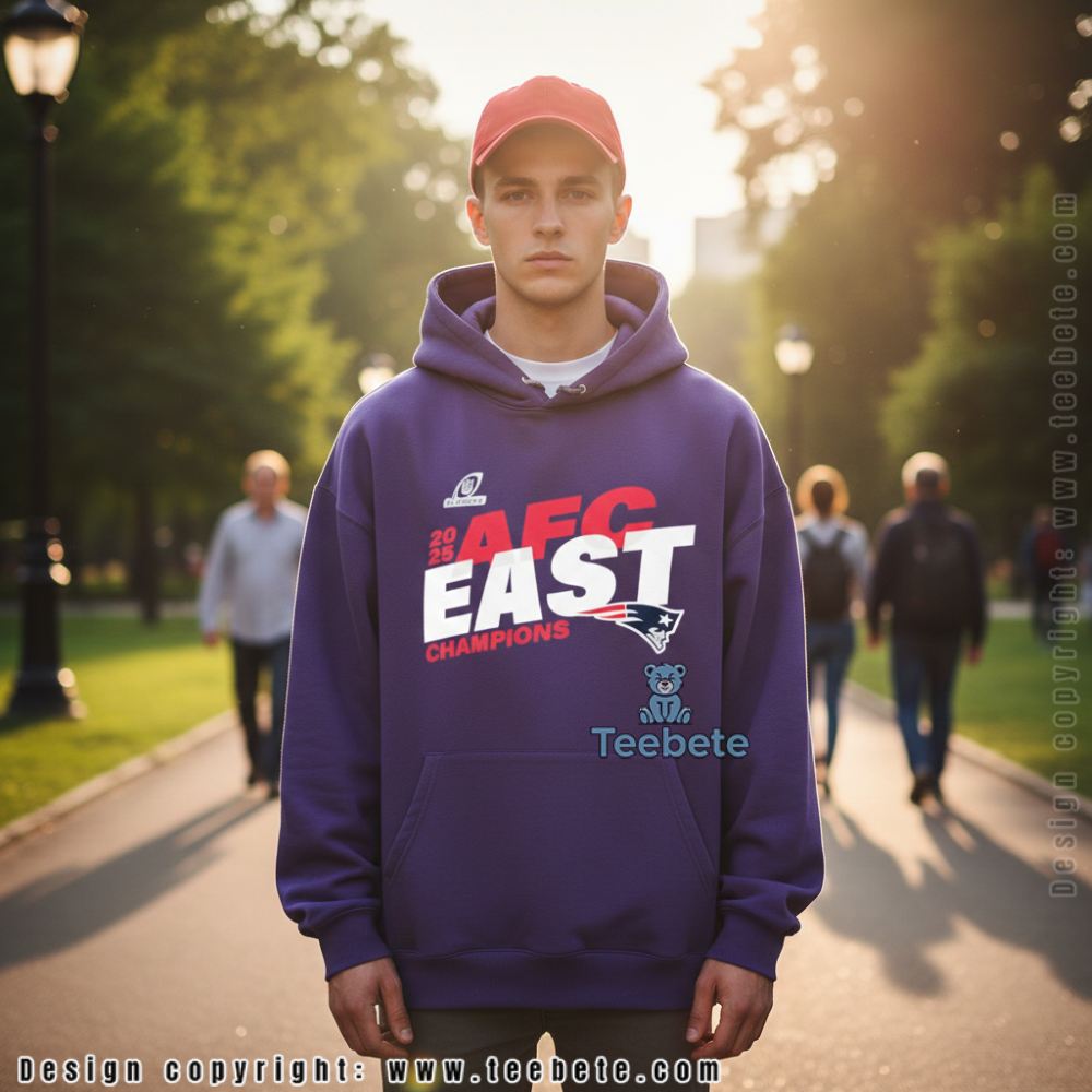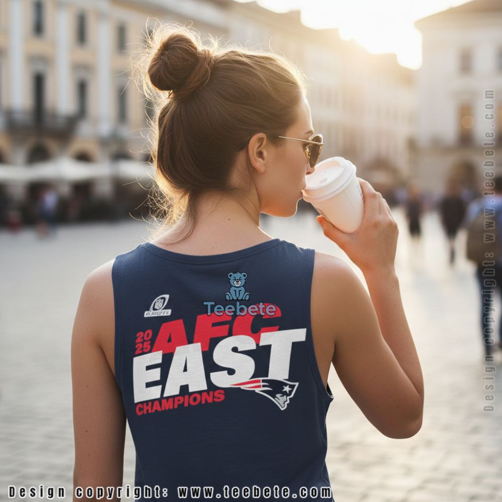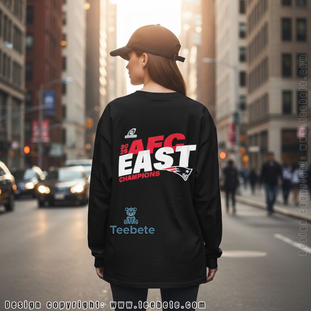 The front of the shirt features a bold, multi-layered “AFC EAST CHAMPIONS” headline, immortalizing the moment the Patriots secured their latest divisional crown.