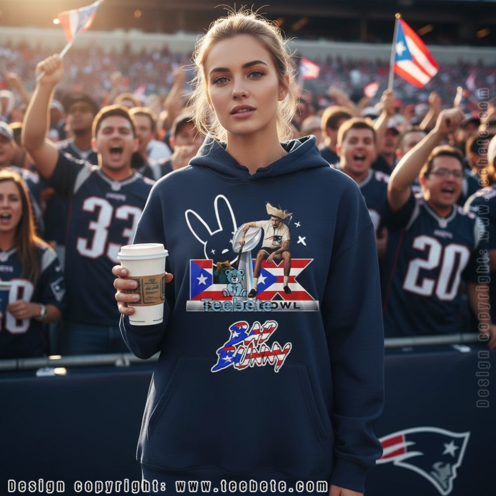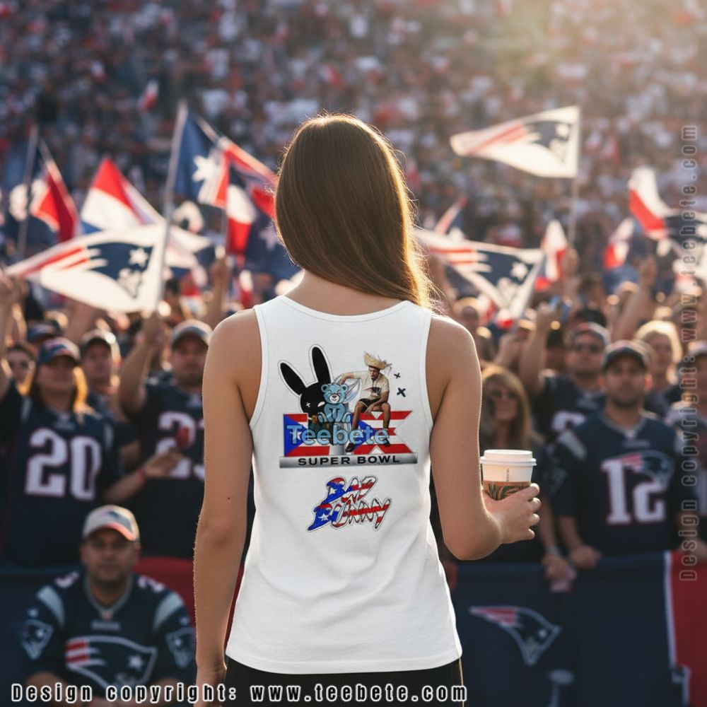 This New England Patriots Bad Bunny Lx Super Bowl Champions Shirt features a bold back print on a classic black t-shirt base. The design centers on a stylized bunny character outline at the top, rendered in simple white linework with small star accents. Below this sits a prominent championship trophy graphic overlaid on a Puerto Rican flag background featuring red and white stripes with a blue triangle and white star. “SUPER BOWL” text appears in bold black letters beneath the trophy image. The lower portion displays “BAD BUNNY” text with a patriotic red, white, and blue color fill that mirrors the flag motif above, creating visual cohesion between the stacked graphic elements.