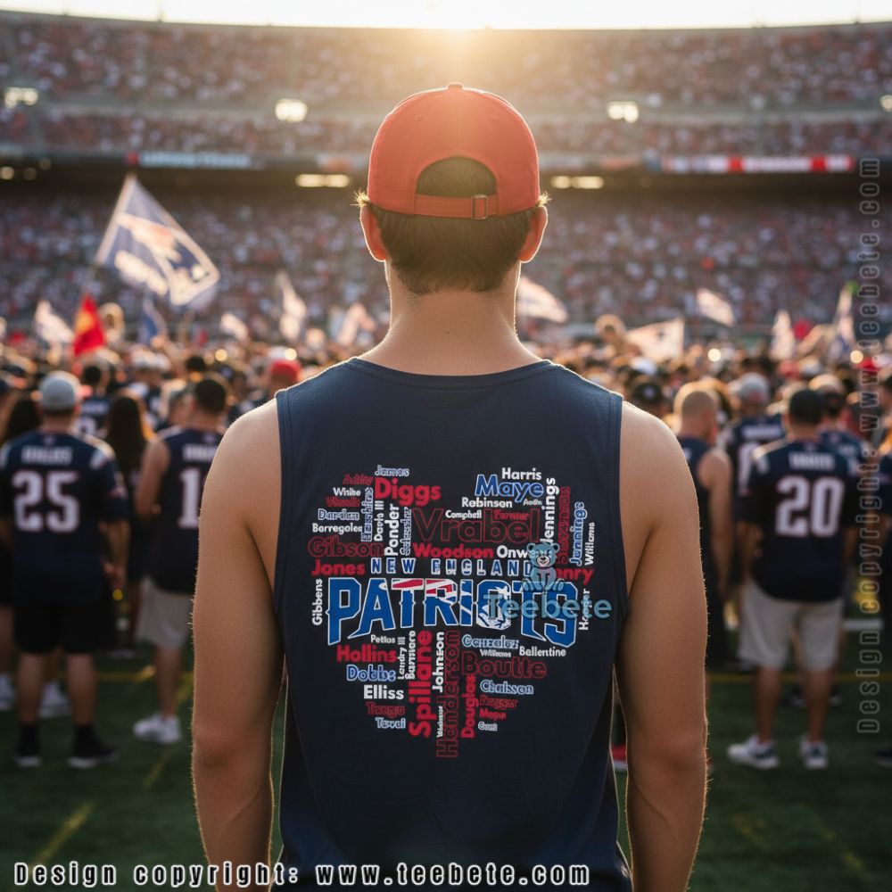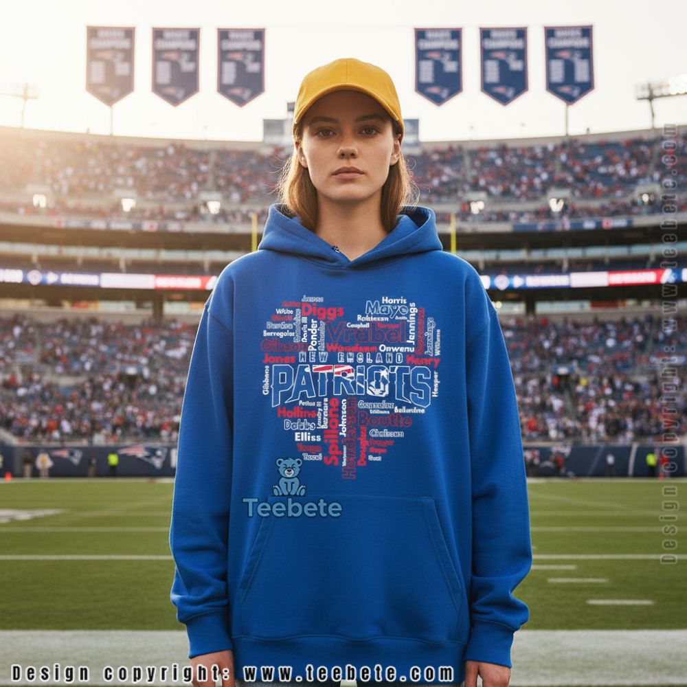 Wear your love for Patriots legends with the New England Patriots Heart Shape Players Names List Shirt, a creative tribute that transforms decades of roster greatness into a symbolic heart filled with the names that built a dynasty, now available at Teebete. This innovative design is available in multiple styles including a classic Crewneck T-shirt for everyday wear, a warm Hoodie for stadium outings, a comfortable Sweatshirt for casual gatherings, a V-Neck option for relaxed styling, Long Sleeve versions for cooler weather, and Tank Tops for active days—each style preserving the intricate name cloud and heart silhouette with sharp typographic detail.