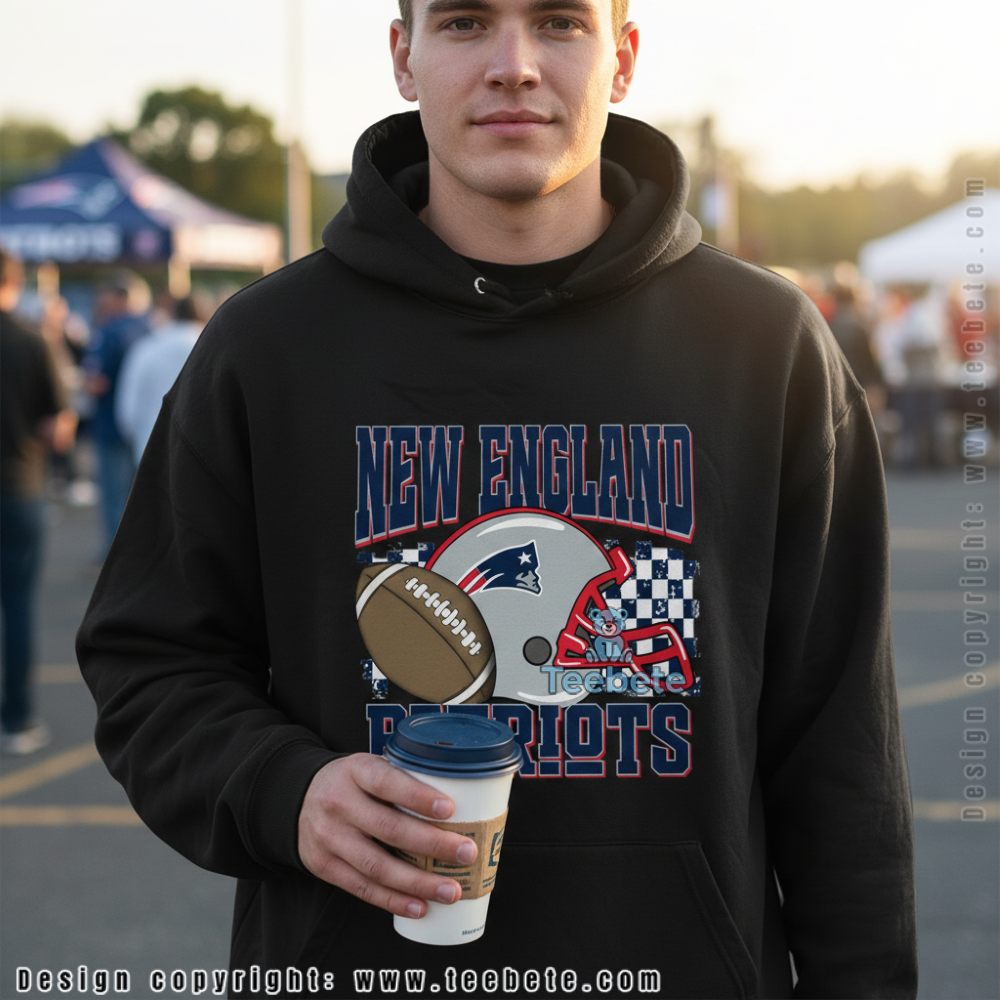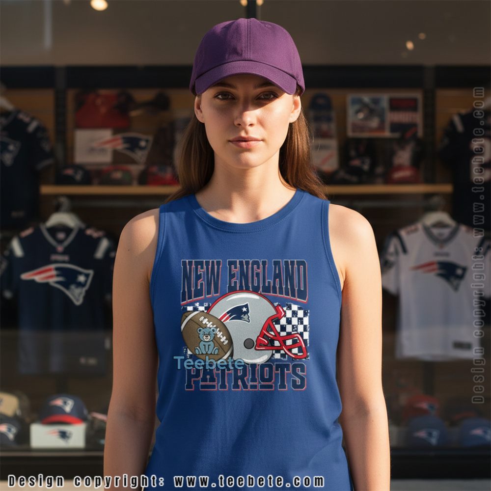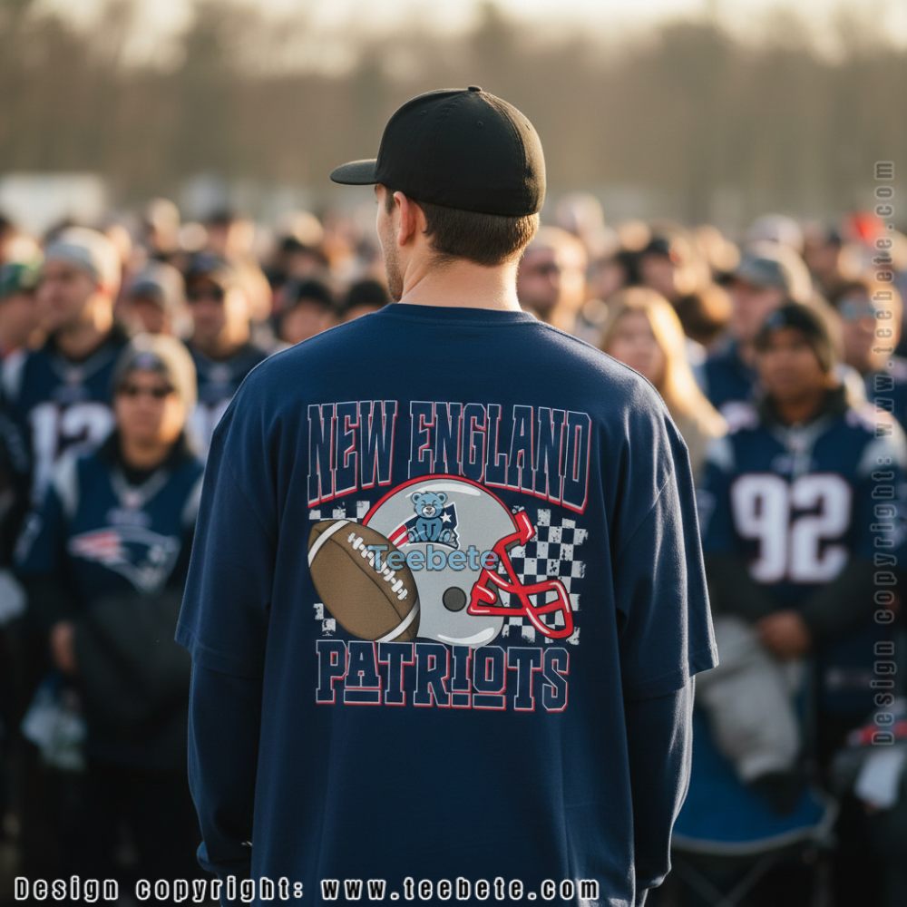 A classic design created for New England Patriots supporters, this tee showcases team pride with bold graphics and iconic team elements. The design features “NEW ENGLAND” arched at the top in navy italic lettering with a checkered flag pattern, the Patriots helmet prominently centered with a football graphic, and “PATRIOTS” displayed below in matching navy text. Shown in light blue, this shirt is also available in multiple colors including navy, gray, red, and white.