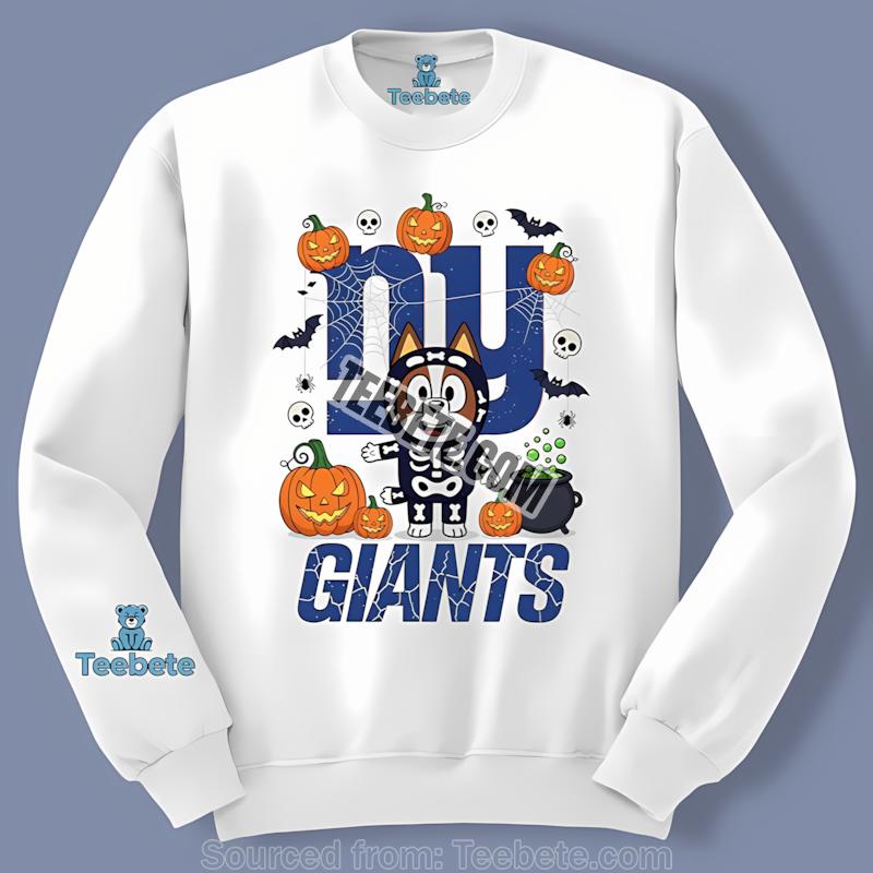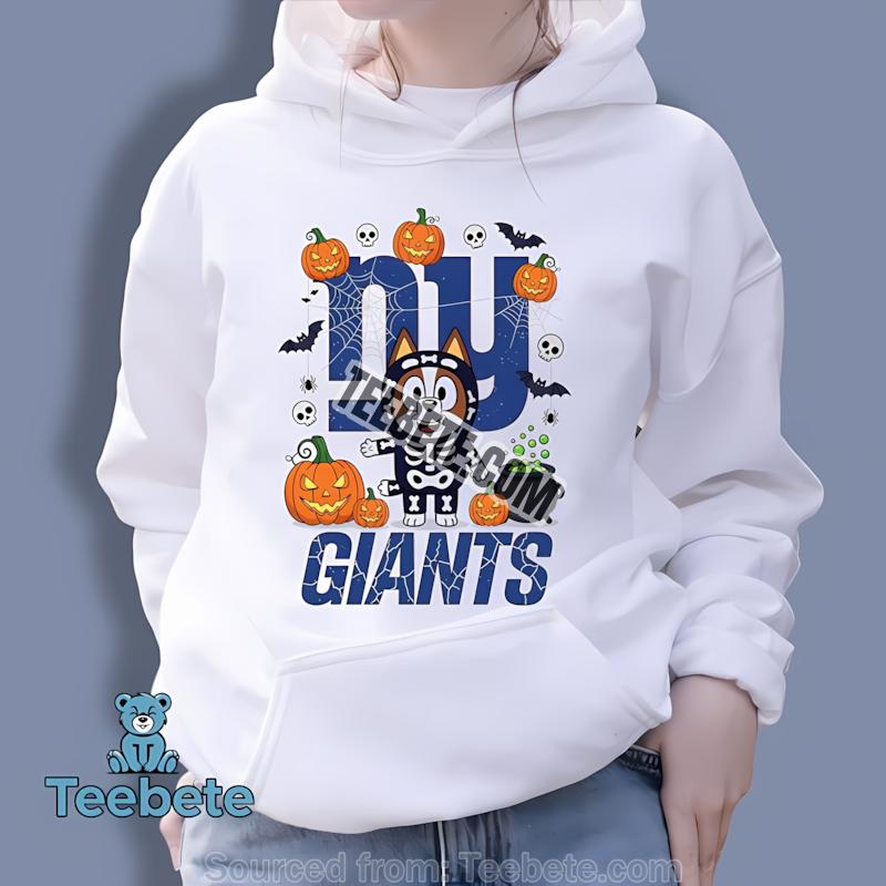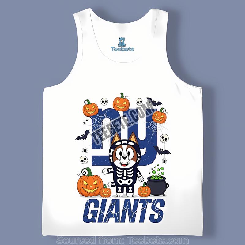 Embrace the festive atmosphere and showcase your team pride by purchasing the New York Giants Bluey Bingo Halloween Skeleton Pumpkin Shirt now!