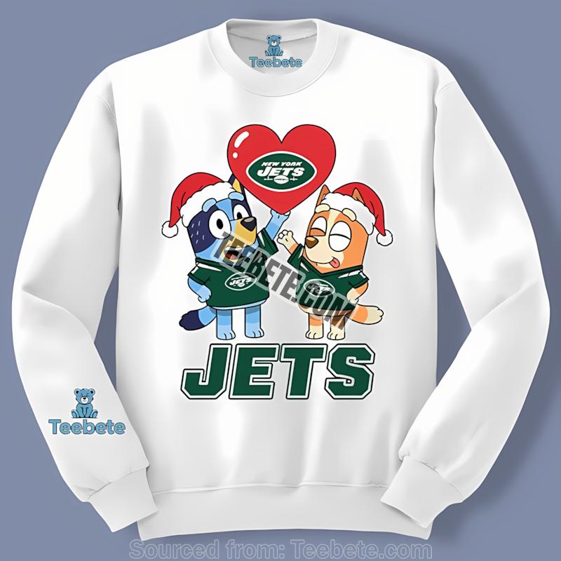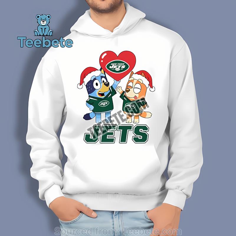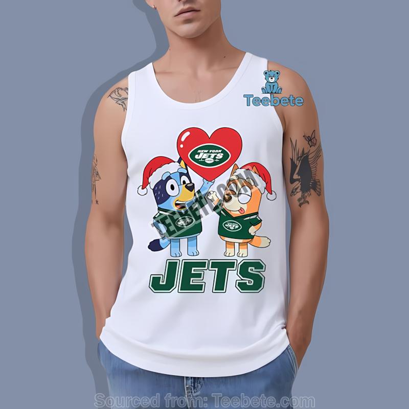 Experience the essence of celebration blended with team spirit through this stylish and heartwarming addition to your wardrobe. Inspired by the joys of the holiday season and a love for football, it encapsulates a vision where family togetherness and fandom unite, creating cherished moments that linger long after the season has ended. This New York Jets Bluey And Bingo Christmas Heart Shirt is more than just apparel—it’s a statement piece for every devoted fan.