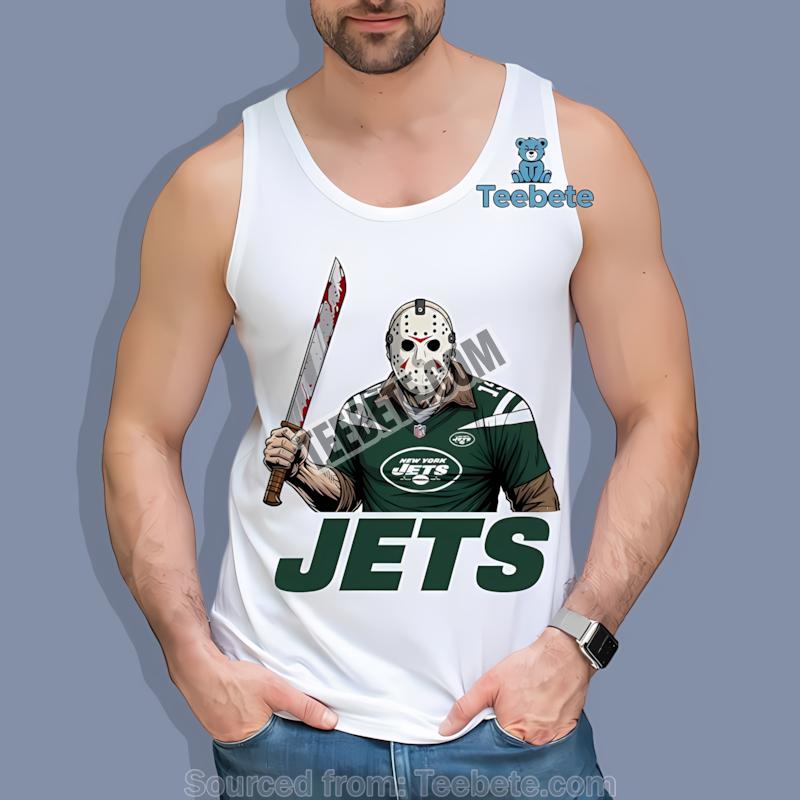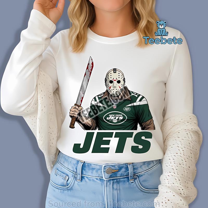 Elevate your game-day wardrobe and embrace your passion for both horror and football today. Order the New York Jets Jason Voorhees Machete Football Horror Shirt from Teebete now, and celebrate your fandom in style!