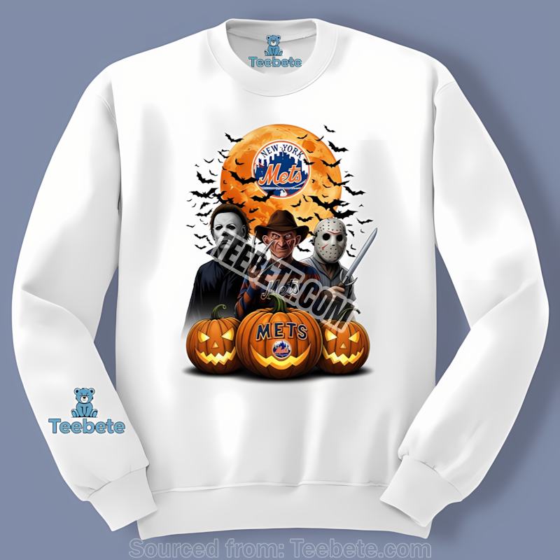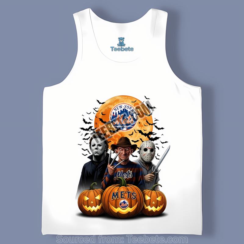 Show your love for the Mets while embracing the spooky spirit with this New York Mets Halloween Jason shirt. This bold design features the instantly recognizable silhouettes of Jason Voorhees, Michael Myers, and Freddy Krueger superimposed against the classic Mets logo. Think of the conversations it will spark! The high-quality cotton fabric and durable construction guarantee this shirt will become a staple in your fall wardrobe for years to come, standing up to multiple washes and still looking great. The vibrant colors ensure that the intricate details stand out, showcasing the creative blend of baseball and horror themes. Pair it with your favorite jeans and sneakers for a casual look, or dress it up with a leather jacket for a more edgy feel.