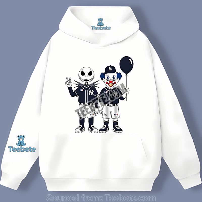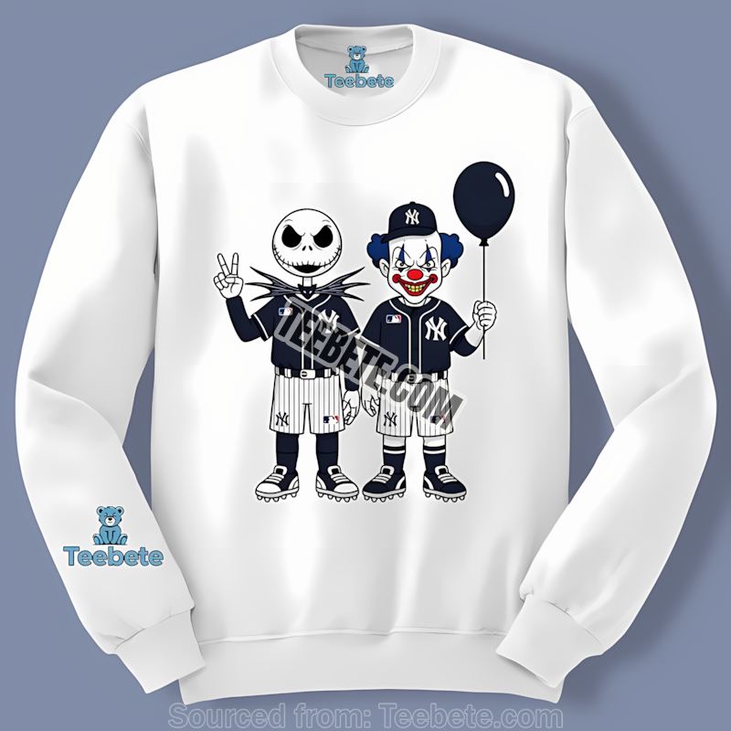 Unleash your inner ghoul this Halloween season with the ultimate mashup of baseball fandom and spooky fun! The New York Yankees Halloween Jack Skellington Pennywise Retro Shirt is more than just apparel; it’s a statement. Inspired by the chilling worlds of Tim Burton’s *Nightmare Before Christmas* and Stephen King’s *It*, this design captures the spooky spirit of Halloween while celebrating the iconic New York Yankees. We created this unique design for fans who want to showcase their team pride with a thrilling twist.