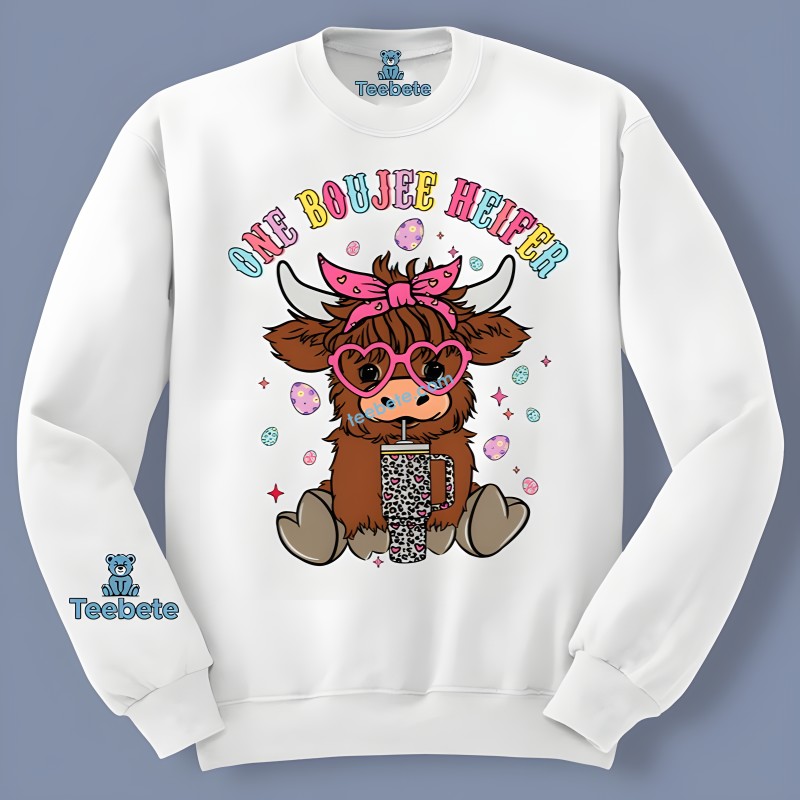 Embrace spring with this adorable One Boujee Heifer With Easter Highland Cow Graphic Shirt from Teebete. Inspired by the playful spirit of Easter and the charming Highland cow, this design celebrates the beauty of nature and a touch of sassy sophistication. We wanted to create a shirt that captures the joy of spring and the unique charm of these majestic creatures.