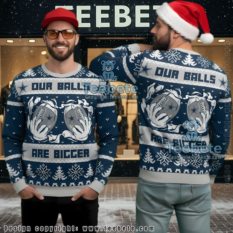 Get ready to show off your team spirit with the Dallas Cowboys Our Balls Are Biccer Logo Couples Ugly Christmas Sweaters Blue. This festive apparel is perfect for any Cowboys fan looking to embrace the holiday season in style. With a unique design that celebrates the pride of being a true supporter, this product will make you the star of any holiday gathering.