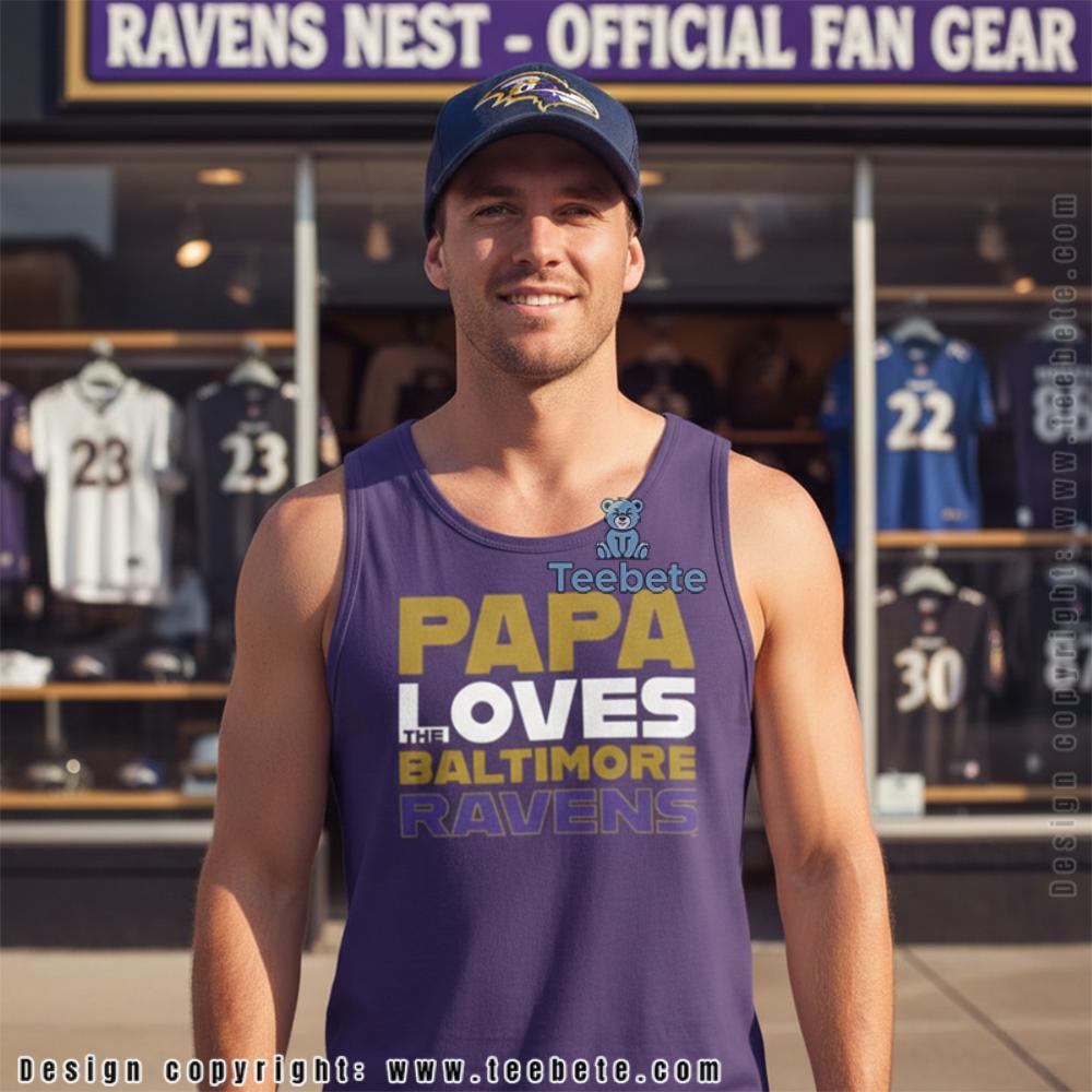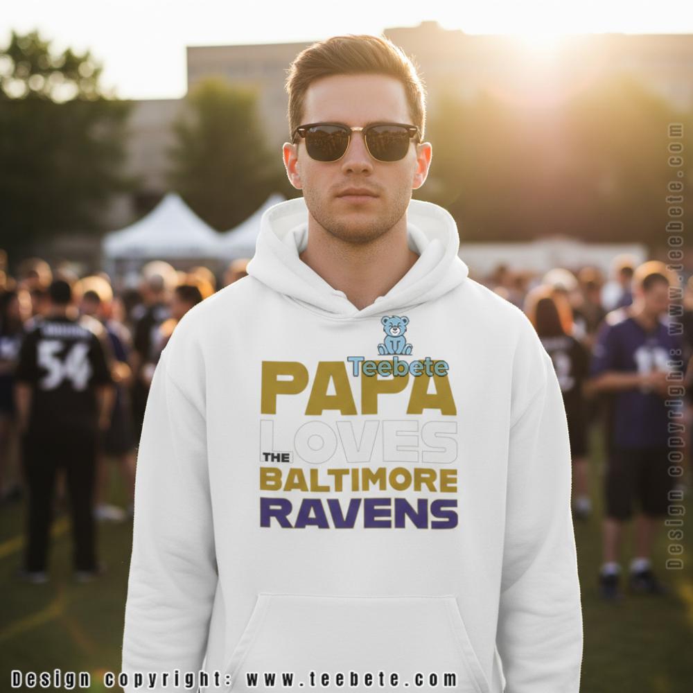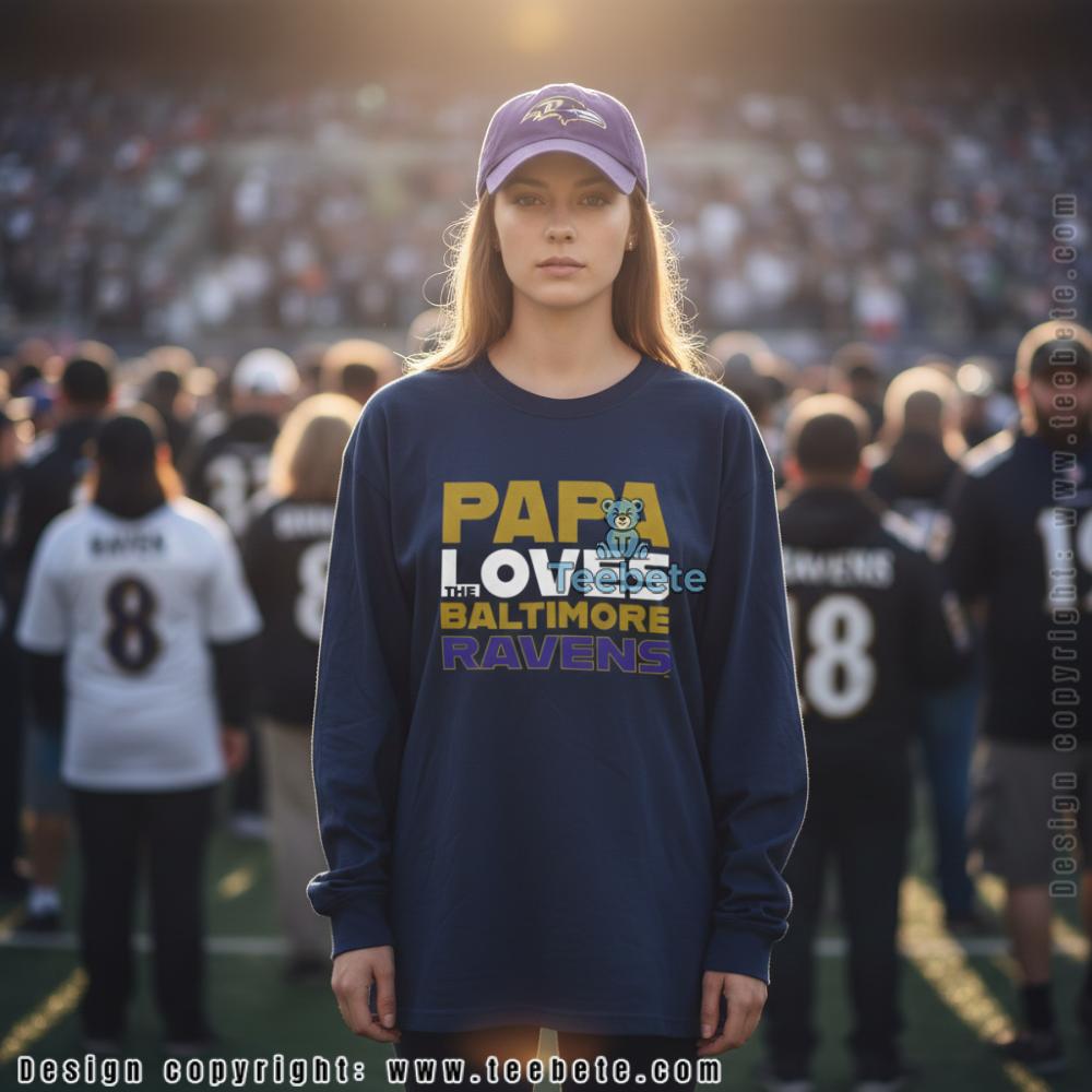 Bold stacked typography commands attention on this t-shirt, with “PAPA” in oversized gold block lettering dominating the top line, followed by “LOVES” in white text of medium proportions. “THE” appears in minimal sizing between larger phrases, while “BALTIMORE” continues in metallic gold and “RAVENS” completes the declaration in vibrant purple at the bottom. The Papa Loves The Baltimore Ravens Football Shirt features this multi-line text arrangement centered against black fabric, creating maximum contrast that allows each word to pop clearly. Team colors distribute strategically throughout the composition—gold for emphasis on “PAPA” and “BALTIMORE,” purple for “RAVENS,” and white for connective text—establishing authentic Baltimore identity through color coordination alone. The varying font sizes create natural reading flow that draws the eye from paternal subject down to team name, while classic crew neck construction provides comfortable everyday wear.