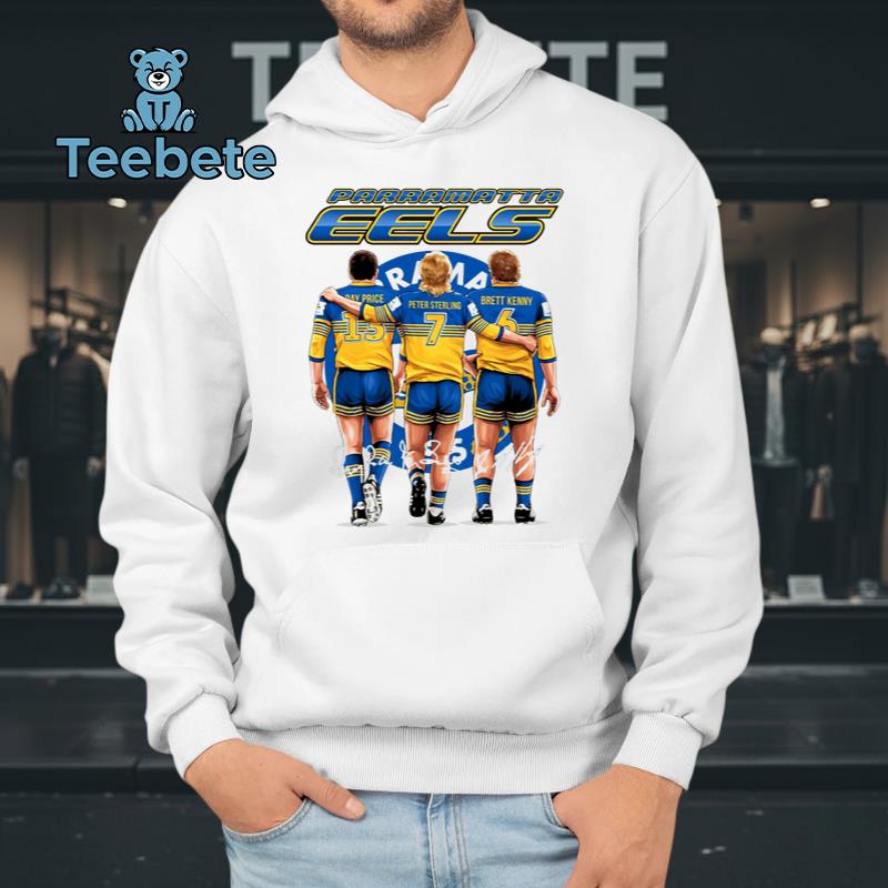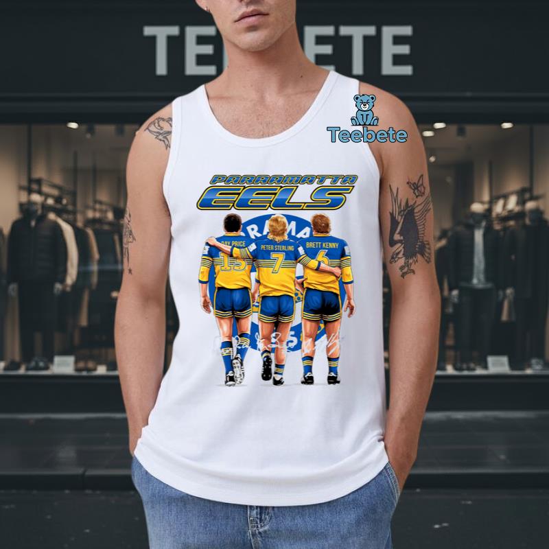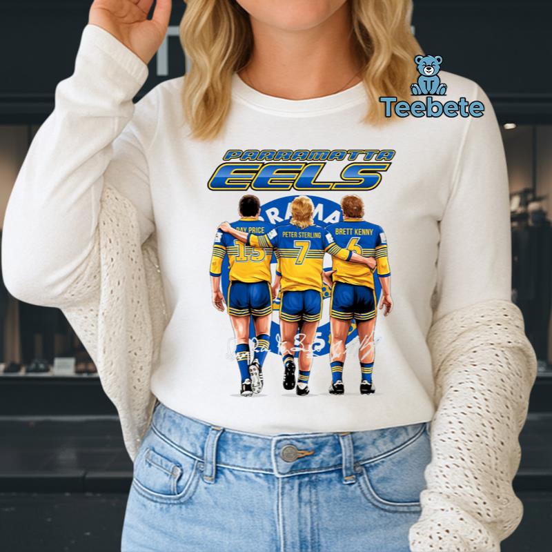 The dynamic design of this T-Shirt captures the essence of rugby fandom with a vivid tableau featuring the iconic Parramatta Eels. A central graphic illuminates the storied careers of Ray Price, Peter Sterling, and Brett Kenny, arranged in a stylish collage that highlights each player’s unique contribution to the team. Rich blues and golds dominate the color palette, creating a powerful contrast that resonates with fans. The design employs a centered graphic composition, allowing the imagery to truly stand out against the fabric, making the Ray Price Peter Sterling Brett Kenny Parramatta Eels T-Shirt a must-have for any supporter.