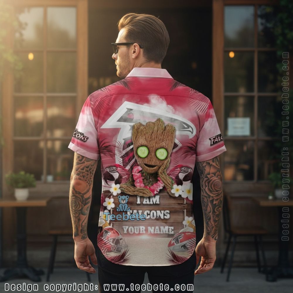 Infused with a lively mix of tropical flair, the Personalized Atlanta Falcons Baby Groot Plumeria Tropical Hawaiian Shirt captures attention through its imaginative design. The shirt features a seamless blend of Baby Groot graphics complemented by plumeria blossoms, interspersed with vibrant green foliage. The arrangement creates a full-coverage visual experience, ideal for expressing team spirit while enjoying a casual outing. The color palette harmonizes with bold reds, deep greens, and subtle yellows, bringing a fresh contrast that enhances the overall aesthetic.