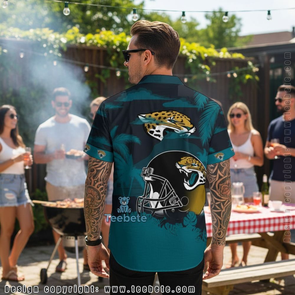 A muscular cartoon jaguar in full football uniform commands the center of the Personalized Jacksonville Jaguars Football Player Hawaiian Shirt, clutching a football while posed in an athletic stance. The character wears team jersey and gear, displaying fierce determination through its roaring expression and powerful build. Palm fronds and tropical leaves in teal shades create layered backgrounds, while horizontal stripes in black and teal add structural elements across the shoulders. “JACKSONVILLE JAGUARS” text appears at the bottom in outlined lettering, anchoring the composition. Team logos scatter across the sleeves, reinforcing branding throughout. This Hawaiian shirt employs sublimation printing on a camp collar design, where cartoon illustration meets tropical botanical accents for a playful yet spirited aesthetic.