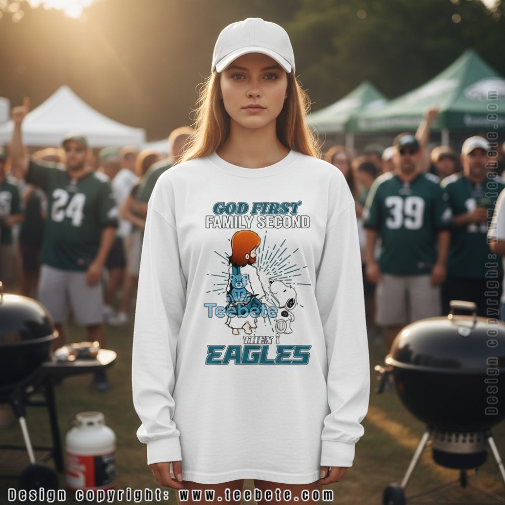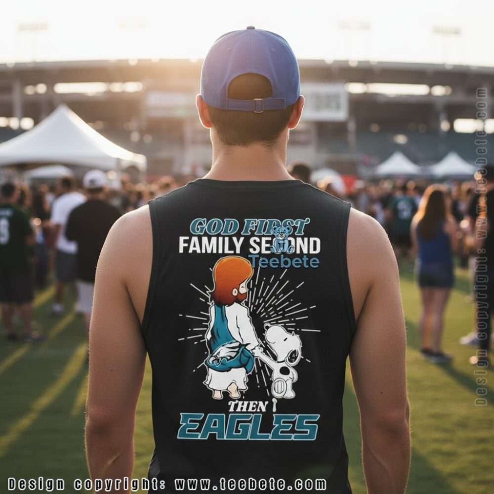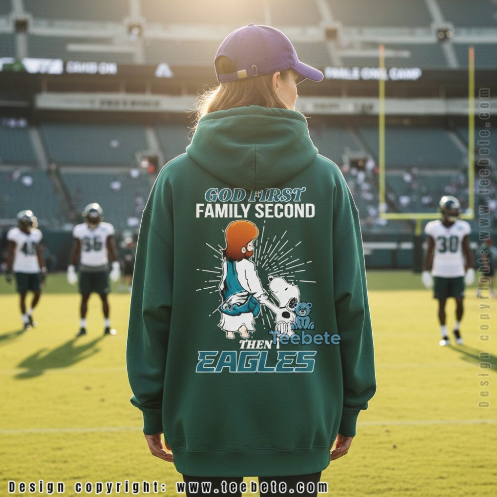 An eye-catching T-Shirt, the Philadelphia Eagles Snoopy God First Family Second Then Eagles Shirt showcases a playful yet passionate design. The layout features a vibrant graphic prominently placed at the center, blending the beloved character Snoopy with bold lettering that highlights devotion to family and football. The color palette is a spirited mix of green, white, and black, embodying the Philadelphia Eagles’ spirit, while a layered collage layout ensures depth and visual interest that grabs attention from all angles.