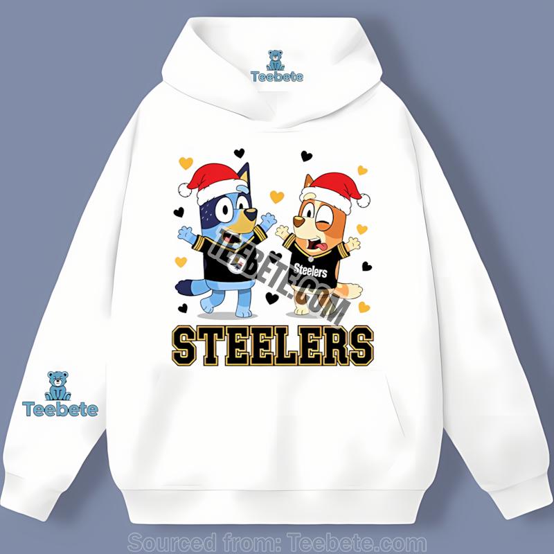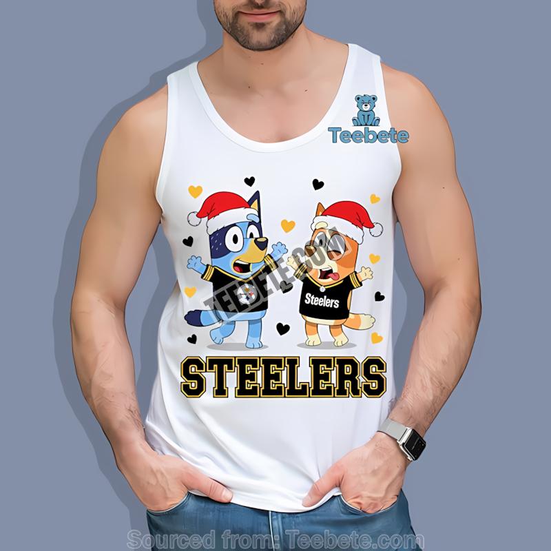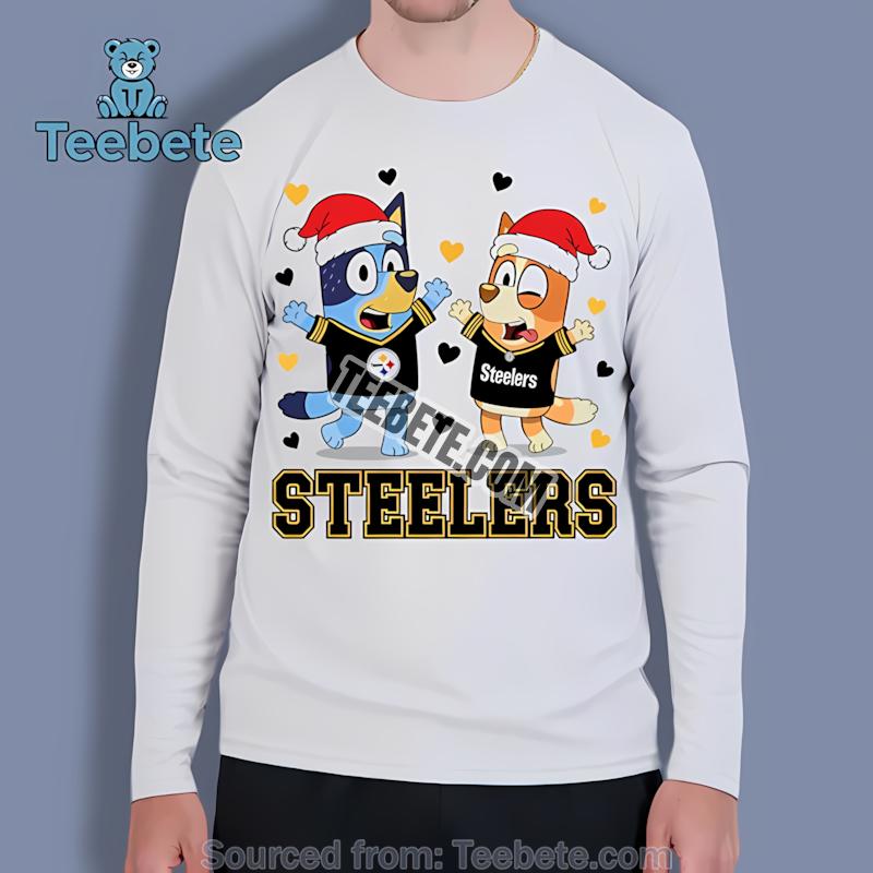 Enhance your holiday wardrobe today with the Pittsburgh Steelers Bluey And Bingo Christmas Dancing Shirt by Teebete. Elevate your team spirit while celebrating the joys of the season—purchase yours now!