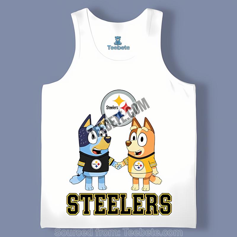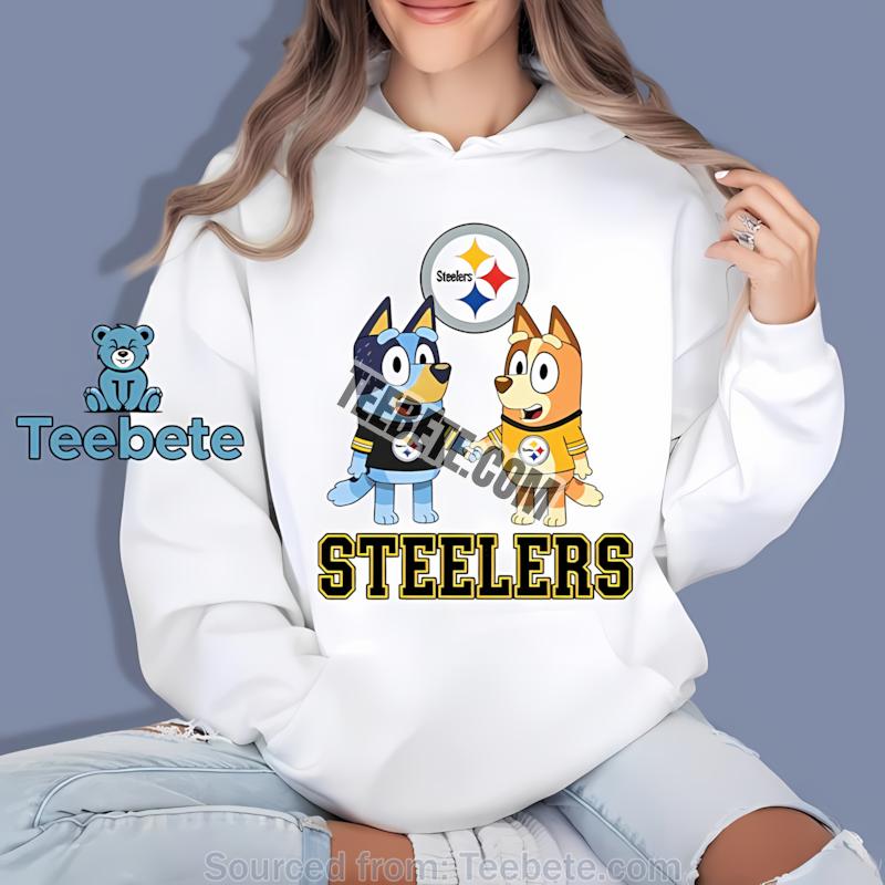 Don’t wait any longer; purchase the Pittsburgh Steelers Bluey And Bingo Holding Hands Shirt now and show off your team spirit with a playful twist!