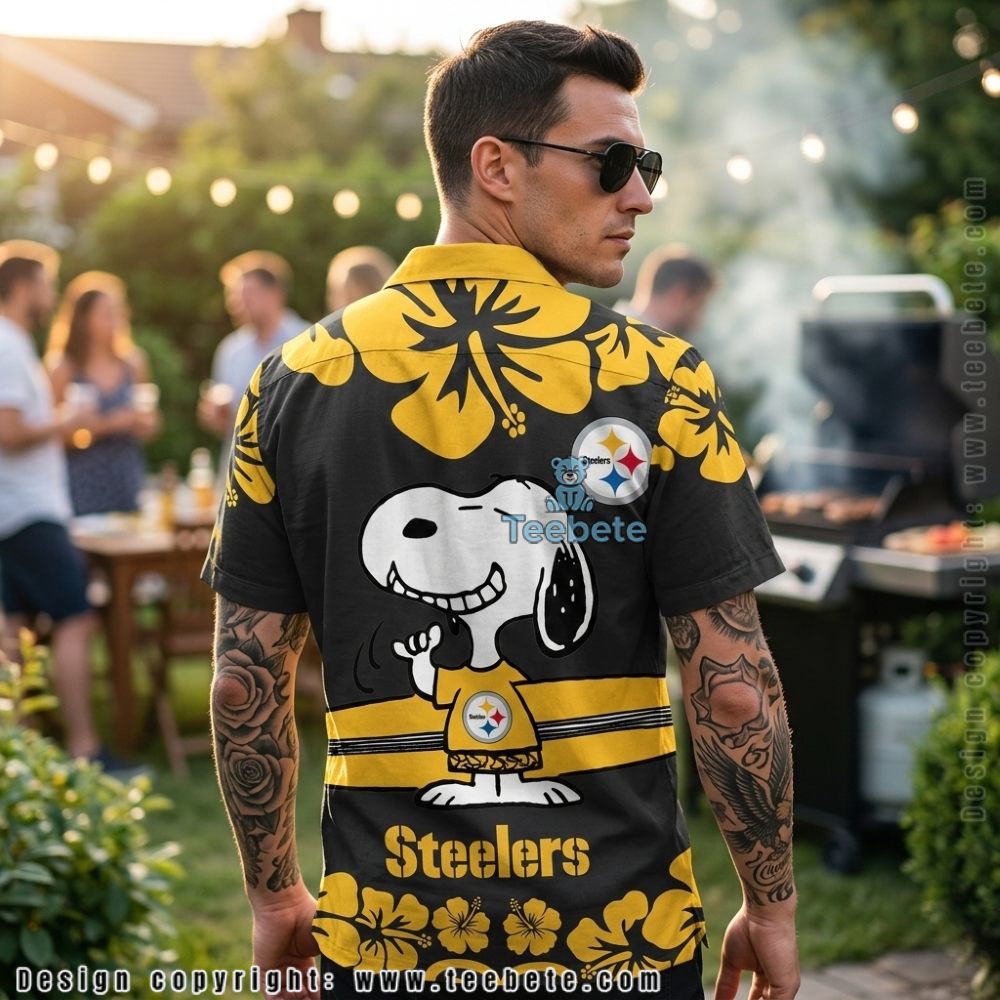 On a rich black background, the Pittsburgh Steelers Snoopy Hibiscus Flower Tropical Summer Hawaiian Shirt bursts forth with a lively arrangement of hibiscus flowers in hues of bright yellow and deep pink. Complemented by playful illustrations of a rounded figure in flat two-color linework, the design seamlessly integrates nautical elements with tropical flora. The floral motifs are generously spread across the torso, while the print density transitions to a lighter touch at the cuffs and collar, ensuring a visually engaging balance that draws attention toward the chest area.