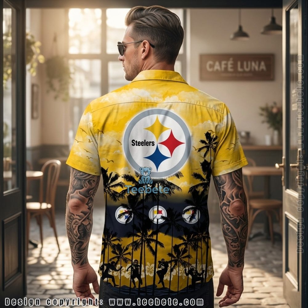 The lively backdrop of the Pittsburgh Steelers Tropical Beach Shirt showcases a playful interplay between vivid palm trees and dynamic football player illustrations, all rendered in a palette of sunny yellows, deep greens, and classic black. The palm trees arch gracefully across the fabric, their silhouettes contrasting sharply with the action-packed scenes of players executed in a bold graphic style. Print coverage is concentrated around the torso, creating a focal point that draws the eye, while the design becomes lighter near the cuffs and collar, allowing for a breezy, open feel.