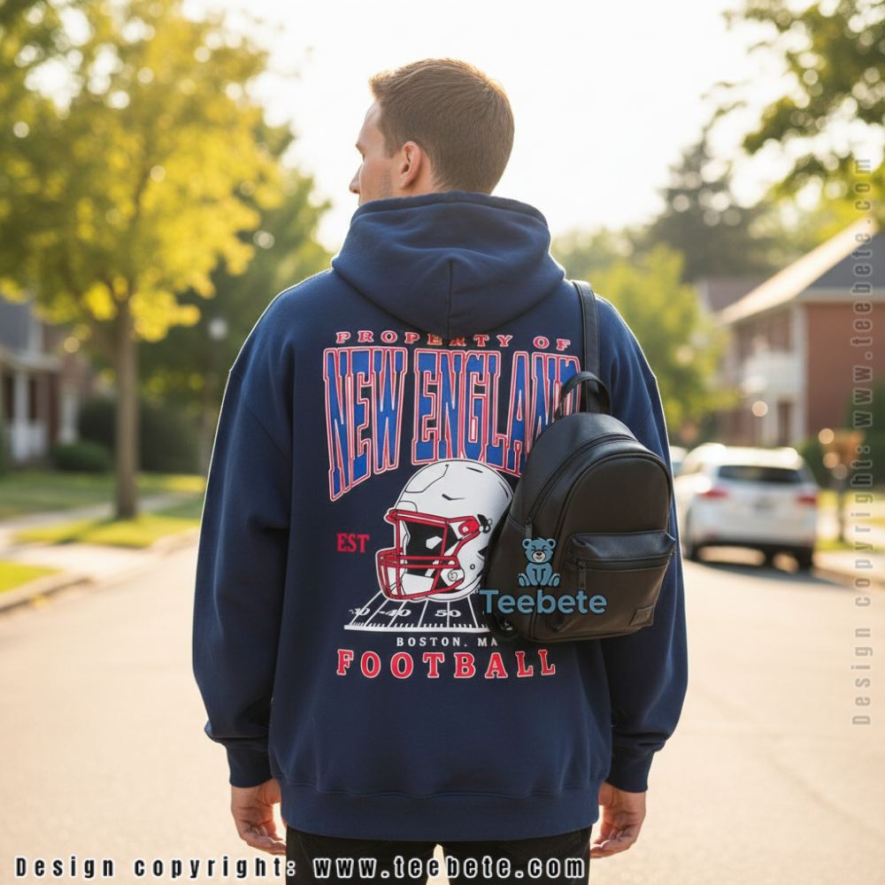 Arched above the helmet is the “PROPERTY OF” text, followed by a massive, collegiate-style “NEW ENGLAND” headline in vibrant red and navy blue.