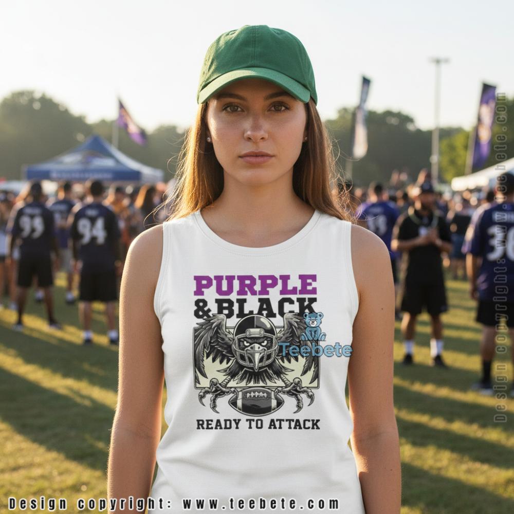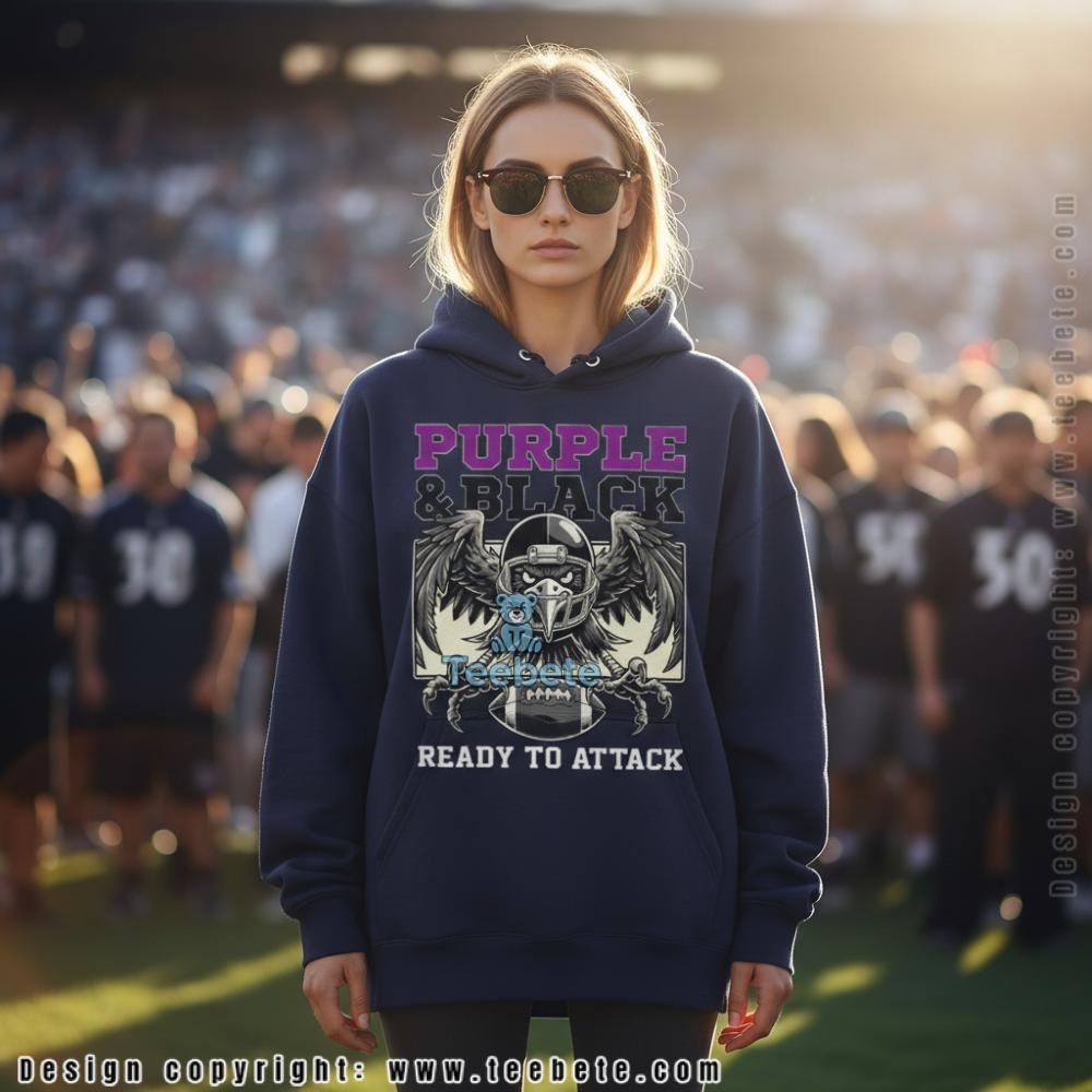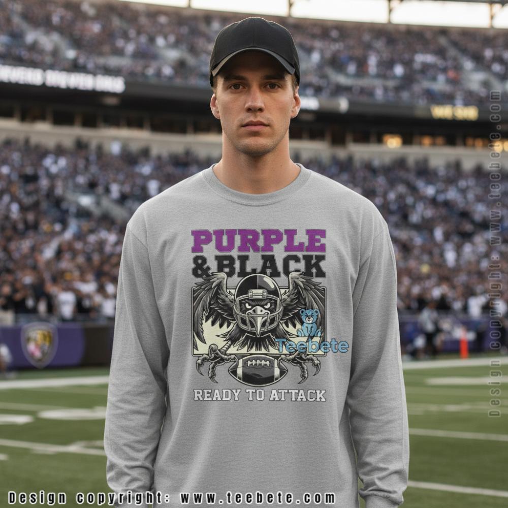 A menacing raven with wings spread wide in attack position dominates the chest of this t-shirt, the bird wearing a football helmet while clutching a football in its sharp talons. “PURPLE & BLACK” appears in bold block lettering above the aggressive bird illustration, with purple text outlined in darker tones creating dimensional effect. Below the fierce raven imagery, “READY TO ATTACK” completes the battle cry in white lettering that reinforces the aggressive stance. The Purple And Black Ready To Attack Raven Shirt Men Women features the detailed bird illustration rendered in grey and black tones with dramatic feather detail throughout the spread wings, positioned prominently against vibrant purple fabric. The combination of team colors in the text, aggressive bird symbolism, and combat-ready messaging creates cohesive design that channels Ravens football intensity. Centered graphic placement on the front panel delivers the intimidating statement through classic crew neck t-shirt construction.