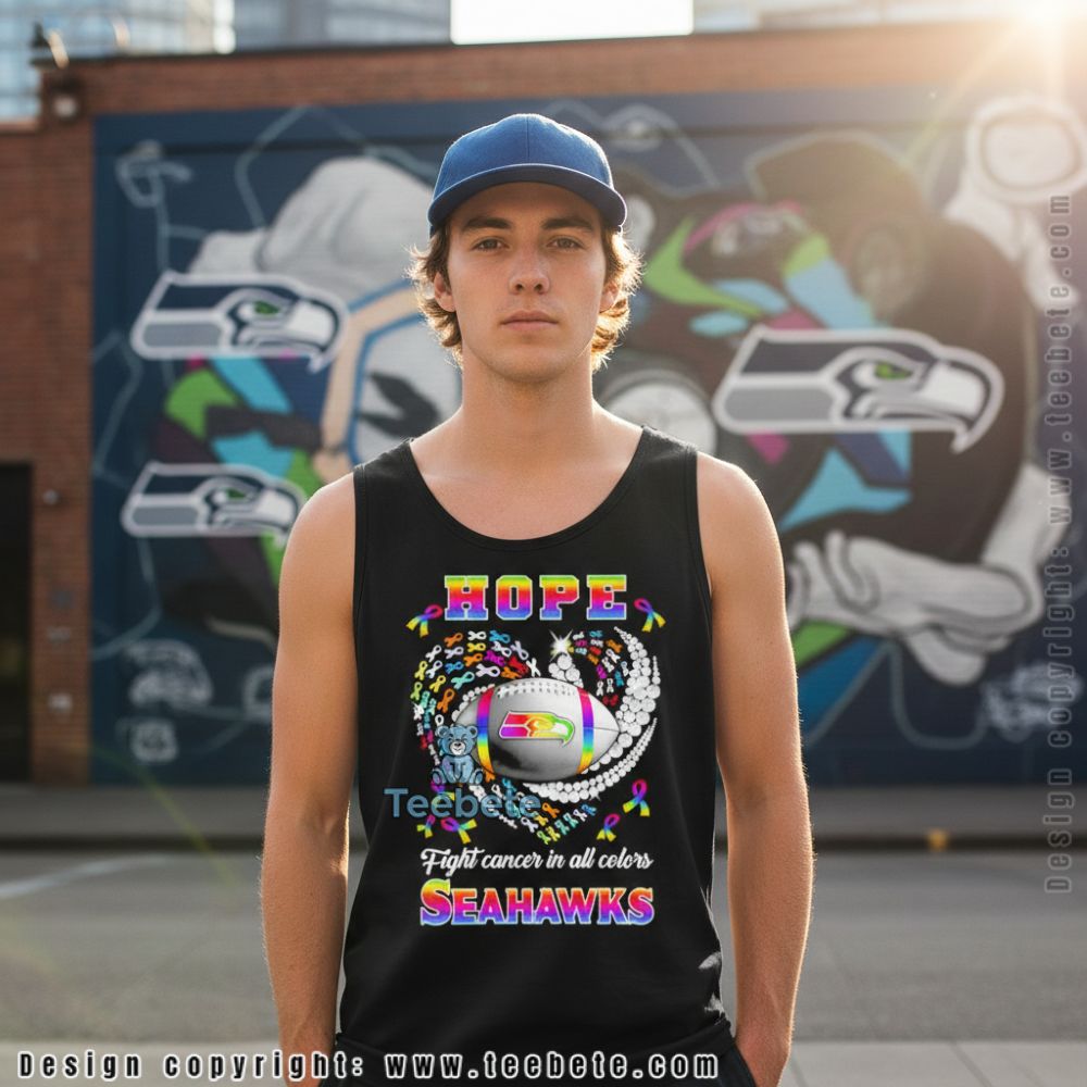 A fan-inspired design for Seattle supporters, this Rainbow Hope Seattle Seahawks Cancer Awareness Tee combines team pride with meaningful advocacy. The design features “HOPE” in vibrant rainbow lettering above a football surrounded by colorful ribbons and pearl-like accents, with “Fight cancer in all colors” scripted below and “SEAHAWKS” anchoring the bottom in gradient text. Shown in navy, this independently designed cotton tee is also available in multiple colors including black, sport grey, and team shades.