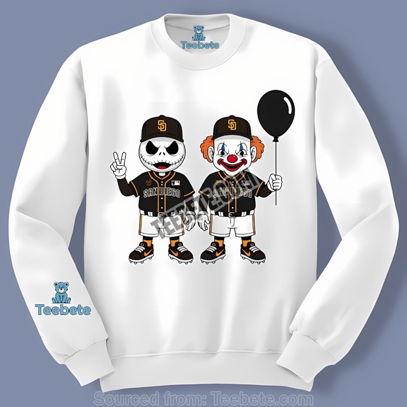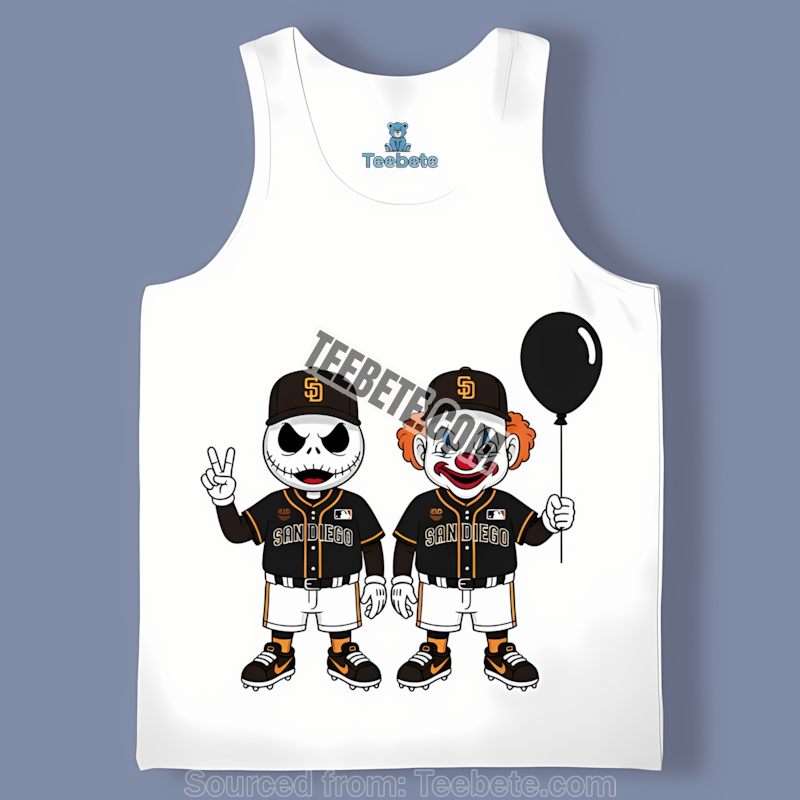 Unleash your inner ghoul with this electrifying San Diego Padres Jack Skellington X Pennywise Halloween Cotton Shirt from Teebete, a unique design celebrating the spooky season and your unwavering Padres pride. Inspired by the chilling magic of Halloween and the thrill of baseball, this tee merges two iconic worlds, creating a must-have for any fan who appreciates a good fright night and a great game. The design embodies the spirit of unexpected mashups, blending the whimsical nightmare of Jack Skellington with the terrifying clown Pennywise, all while proudly showcasing the iconic San Diego Padres logo.