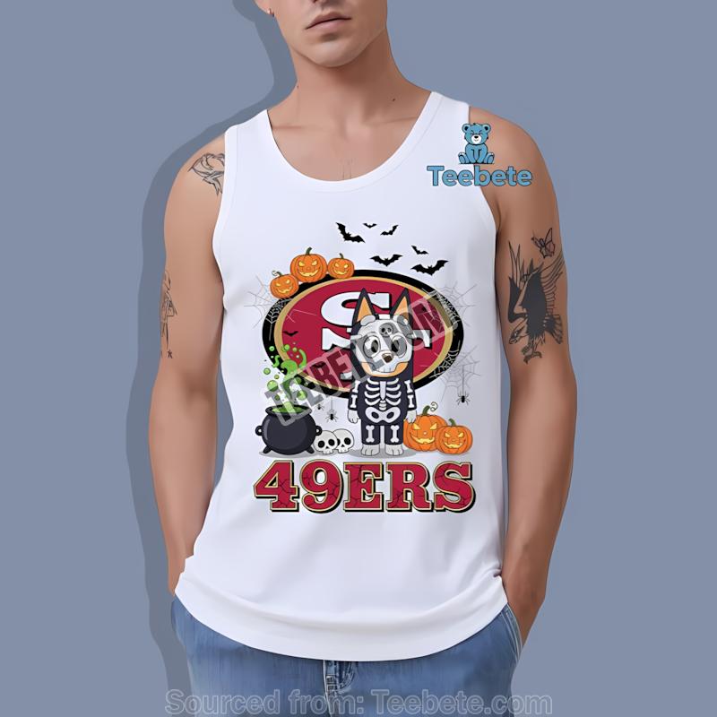 Don’t miss out on the chance to unite your love for football and fun this Halloween. Add the San Francisco 49Ers Bingo Bluey Halloween Skeleton Pumpkin Shirt to your cart today and gear up for a memorable season!