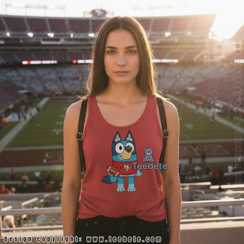 Beloved children’s television character meets NFL team pride through strategic costume styling that keeps Bluey recognizable while incorporating 49ers branding. The neutral shirt base ensures the colorful character artwork pops visually while remaining versatile for everyday wear. Young fans can sport this to family game viewings, casual school days, or weekend outings where both cartoon appreciation and team support shine. The simple back placement and single-color base fabric create approachable kids’ apparel that pairs easily with jeans or shorts throughout football season and beyond.