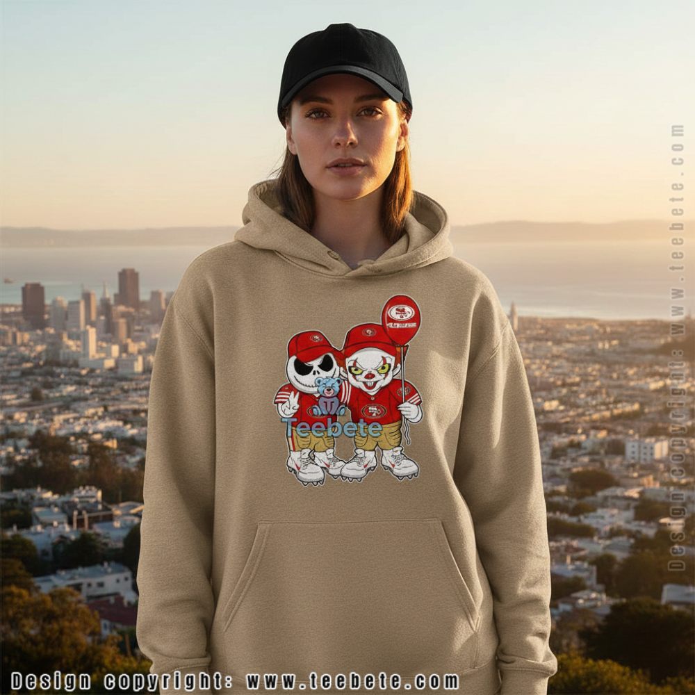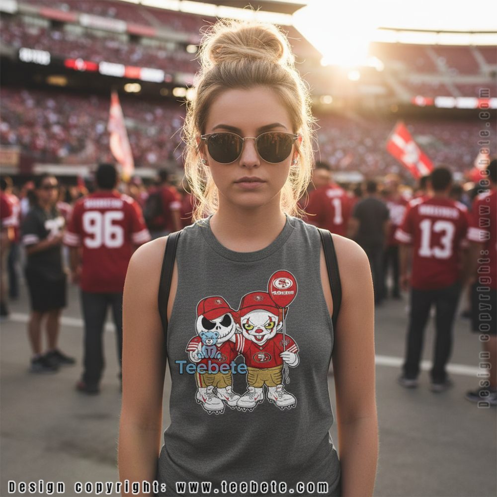 Horror movie icons transform into spirited supporters through matching team apparel and accessories, creating an unexpected crossover for genre-loving football fans. The dual character approach doubles the visual interest while the contrasting white faces pop dramatically against the black base fabric. Supporters can wear this to Halloween game days, horror-themed tailgates, or any October matchup where spooky season meets sports passion. The back-print placement ensures the full graphic remains visible while allowing clean front styling, making this an ideal choice for fans who appreciate darker aesthetics blended with their 49ers loyalty.