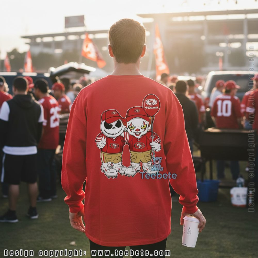 Solid black fabric serves as the backdrop for a back-printed graphic merging two iconic horror characters into football fans. Jack Skellington stands on the left wearing a red 49ers cap and team jersey, his skeletal face featuring the familiar stitched smile and hollow eye sockets. Pennywise occupies the right side, his white clown face topped with a matching red team cap, orange hair peeking from beneath. Both characters sport red jerseys with the San Francisco 49ers oval logo prominently displayed, paired with gold athletic pants and white sneakers. Each holds a team pennant balloon – Jack’s displays “49ers” while Pennywise’s shows the SF logo. Red and white striped details accent their coordinated outfits. The illustration uses bold outlines and flat color fills that maintain each character’s recognizable features while dressing them in synchronized fan gear against the dark background.