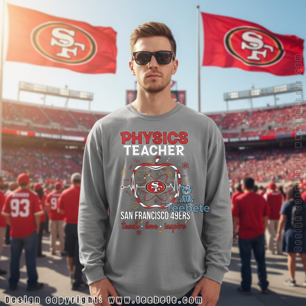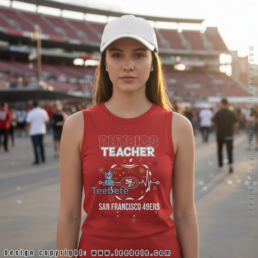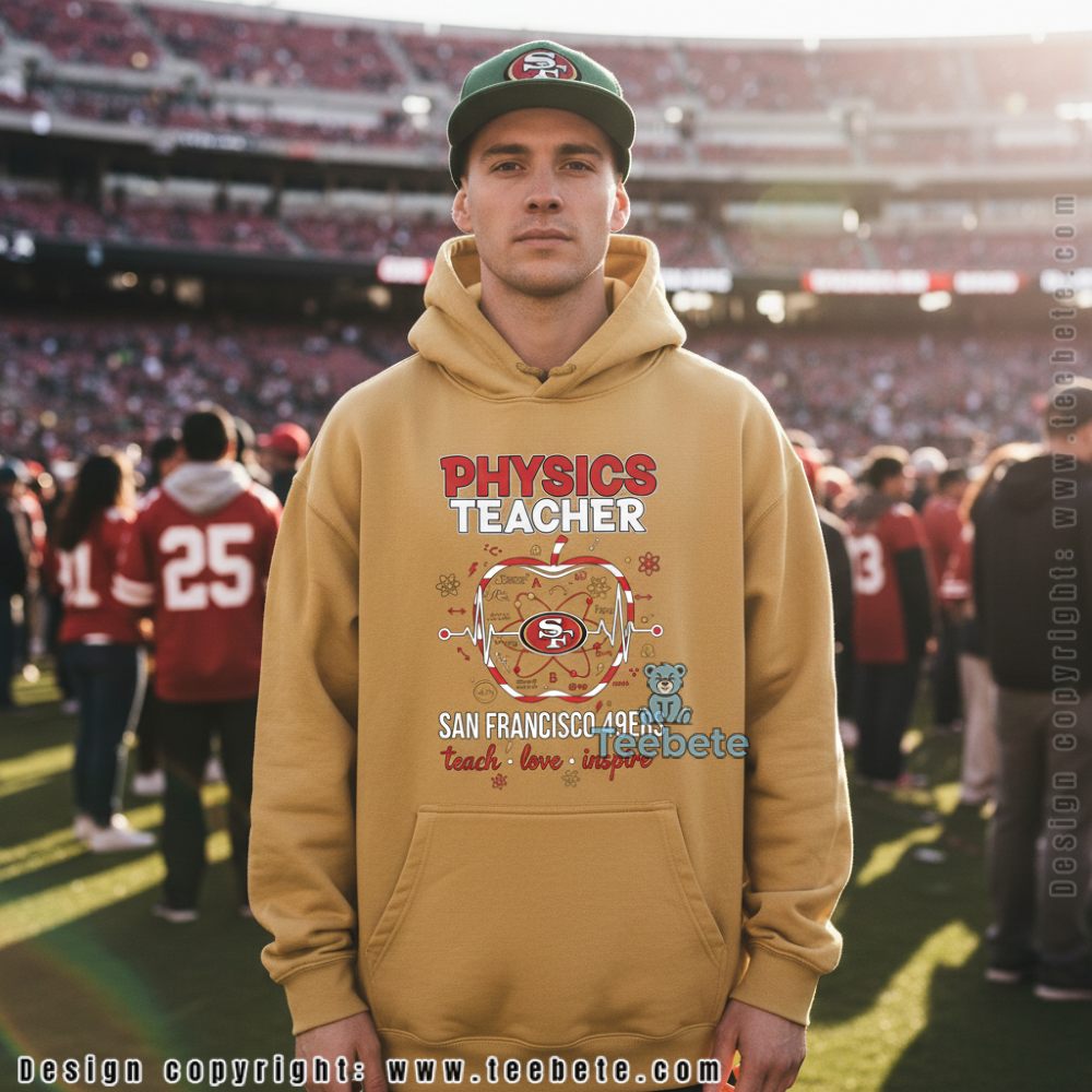 Cream-toned fabric hosts a front-centered graphic blending education themes with team branding. “PHYSICS TEACHER” appears at the top in bold red and white lettering with playful font styling. Below, an atomic diagram surrounds the San Francisco 49ers oval logo, featuring orbital paths in red and gold with small atomic particles and molecular symbols scattered throughout. Scientific notation and physics formulas integrate subtly into the circular composition, creating an educational overlay. “SAN FRANCISCO 49ERS” stretches across in black capital letters beneath the atomic design. At the bottom, cursive red script reads “teach • love • inspire” separated by decorative dots, adding an inspirational teacher sentiment. Small gold and red atomic symbols and stars accent the corners of the design. The entire layout maintains symmetrical balance with the team logo serving as the nucleus of both the atomic structure and overall composition.