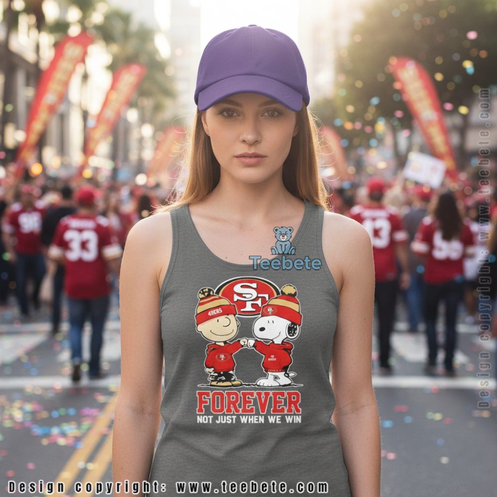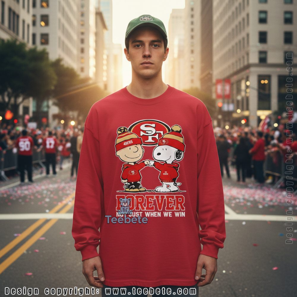 San Francisco 49ers fans who stay loyal through every season will connect with this San Francisco 49Ers Snoopy Shirt Forever Not Just When We Win celebrating unwavering team devotion. The design features beloved Peanuts characters Charlie Brown and Snoopy dressed in 49ers gear, standing together beneath the iconic team logo. Bold red lettering proclaims “FOREVER NOT JUST WHEN WE WIN” across the front, making a powerful statement about true fandom that transcends wins and losses. The black fabric provides striking contrast for the vibrant red and gold graphics.