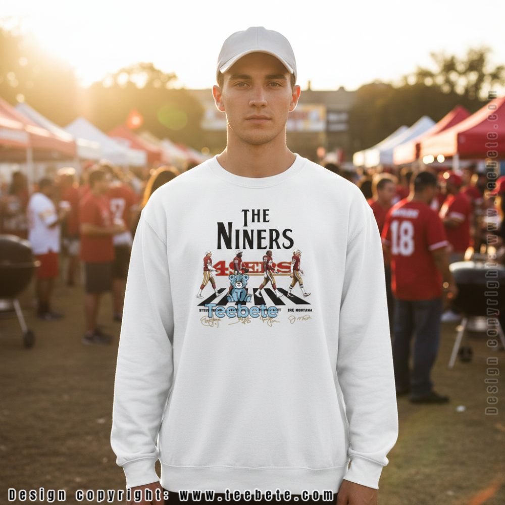 Rock music history intersects with football heritage through clever adaptation of recognizable imagery into team-specific tribute art. The skeleton figures add a playful yet respectful dimension to honoring legendary players, while the crossing scene creates immediate visual recognition. Fans can wear this to commemorate the franchise’s golden era, display knowledge of both sports and cultural history, or simply celebrate the greatest players who built the 49ers dynasty. The combination of iconic album homage and team legends creates conversation-starting apparel that appeals to supporters who appreciate creative crossover designs honoring both pop culture and football greatness.