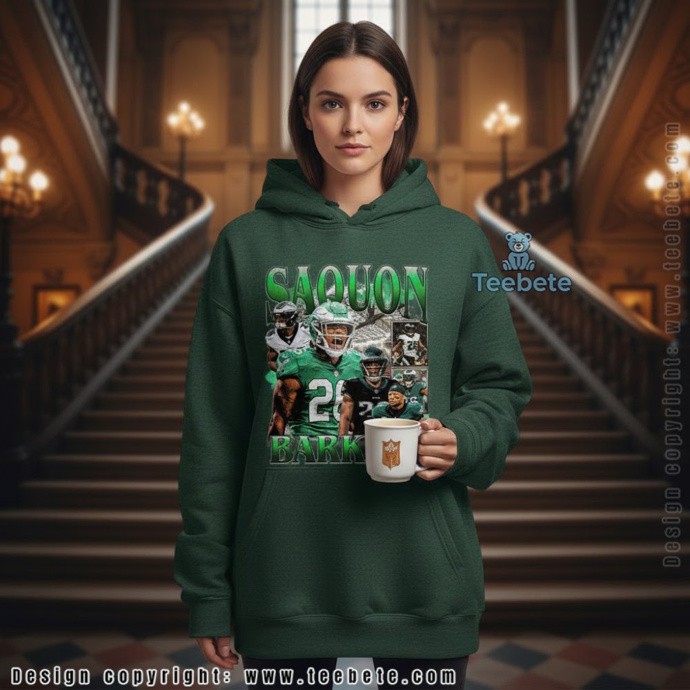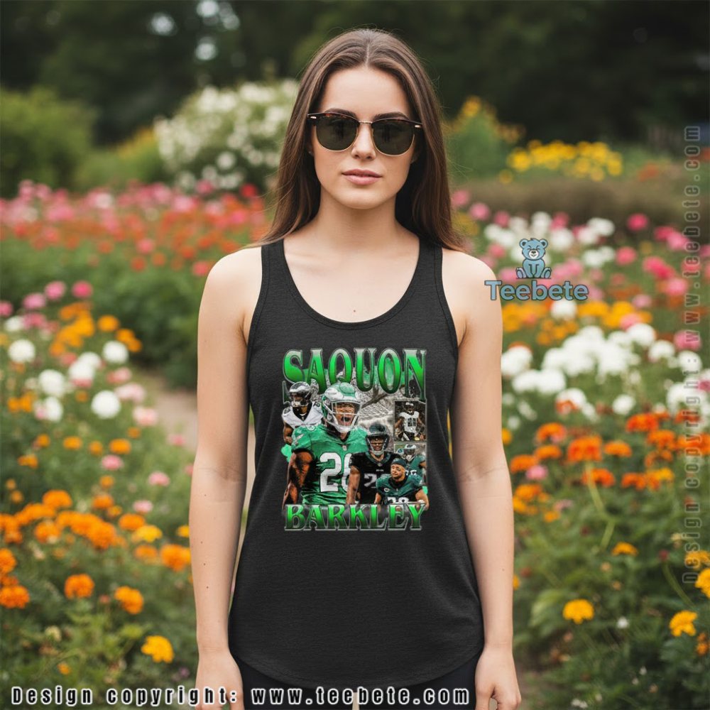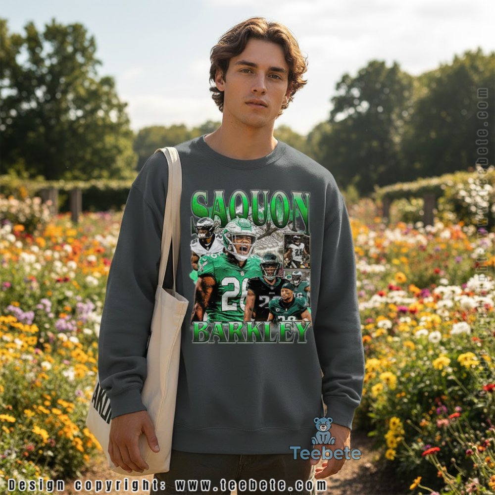 Celebrate franchise-changing acquisition with the Saquon Barkley Eagles Shirt For Men And Women, featuring “SAQUON BARKLEY” typography in bold lime green letters with white outline framing a dynamic five-photo collage showing the running back in his Eagles kelly green jersey number 26, now available at Teebete. This star player tribute design comes in multiple styles including a classic Crewneck T-shirt for celebrating the signing, a warm Hoodie for cold weather games, a comfortable Sweatshirt for everyday support, a V-Neck option for casual fandom, Long Sleeve versions for year-round loyalty, and Tank Tops for summer training camp—each style preserving the lime green typography and five-photo composition with authentic detail.