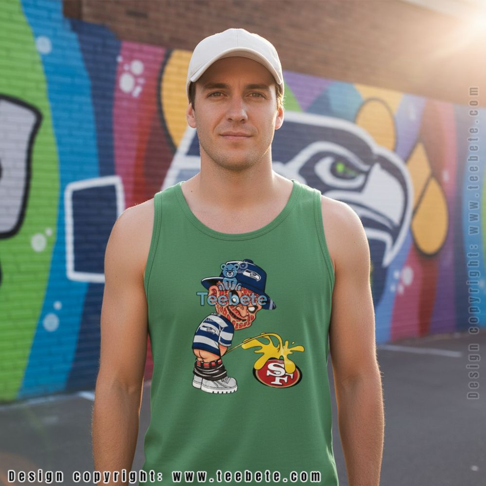 A fan-inspired design for Seattle supporters, this Seahawks 49Ers Memes Freddy Shirt features a bold cartoon character wearing team gear and striking a confident pose while standing over a rival logo. The graphic showcases detailed illustrative work with vibrant color contrast between the team colors and the opposing red and gold elements. Featured in black, this independently designed cotton tee is also available in multiple colors including navy, sport grey, and team shades.