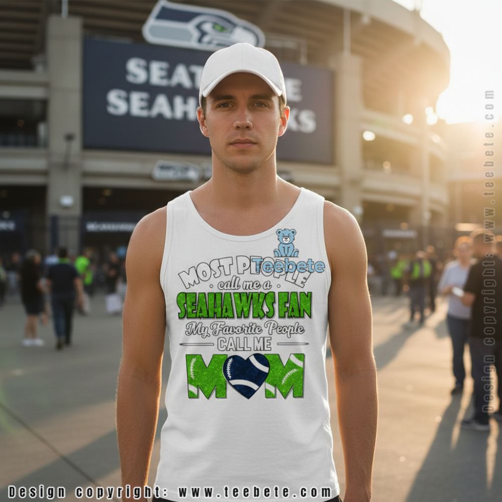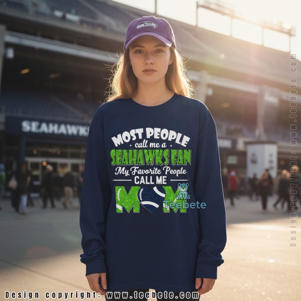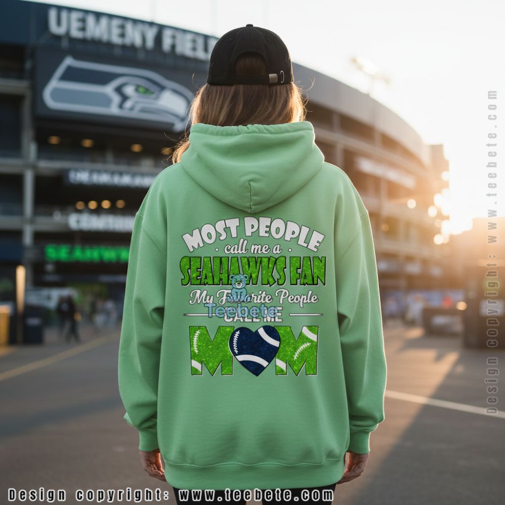 A fan-inspired design for Seattle moms, this Seahawks Fan Mom Gameday Tee features bold typography stating “MOST PEOPLE call me a SEAHAWKS FAN” above “My Favorite People CALL ME MOM” with stylized “M♥M” lettering incorporating team colors and football laces. The vibrant green text contrasts sharply against the charcoal grey background, creating an eye-catching statement piece. Featured in sport grey, this independently designed cotton tee is also available in multiple colors including black, navy, and team shades.