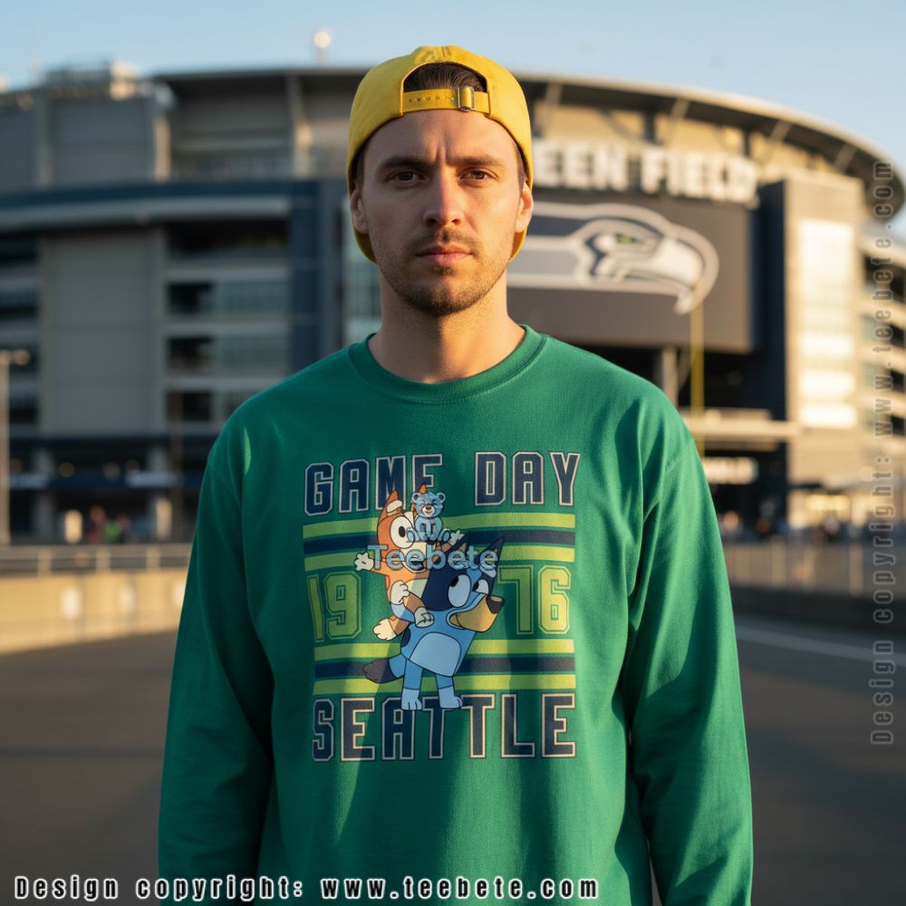 A fan-made design for Seattle supporters, this Seattle Bluey And Bingo Game Day 1976 shirt features beloved cartoon characters Bluey and Bingo dressed in team colors with “GAME DAY” across the top, “1976” split on either side, and “SEATTLE” anchoring the bottom. The design incorporates horizontal stripes in green, navy, and grey behind the characters, creating a playful yet spirited game day aesthetic. Shown in white, this independently designed cotton tee is also available in multiple colors including sport grey, navy, and team shades.