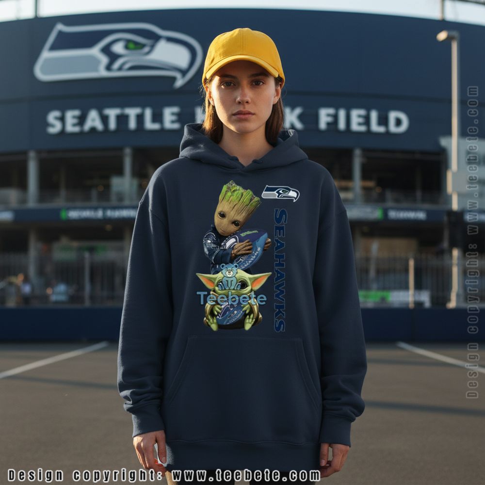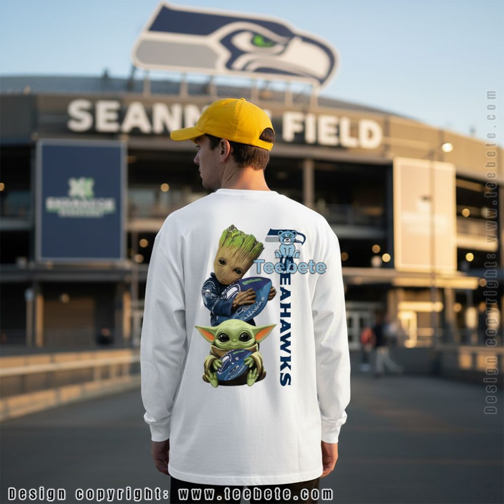 Fans of fantasy worlds and football collide in this Seattle Seahawks Baby Groot And Yoda shirt. Baby Groot clutches a Seahawks helmet while Baby Yoda cradles a football below, both characters decked out in team colors. The back print creates instant recognition whether you’re walking into the stadium or grabbing coffee on Monday morning.