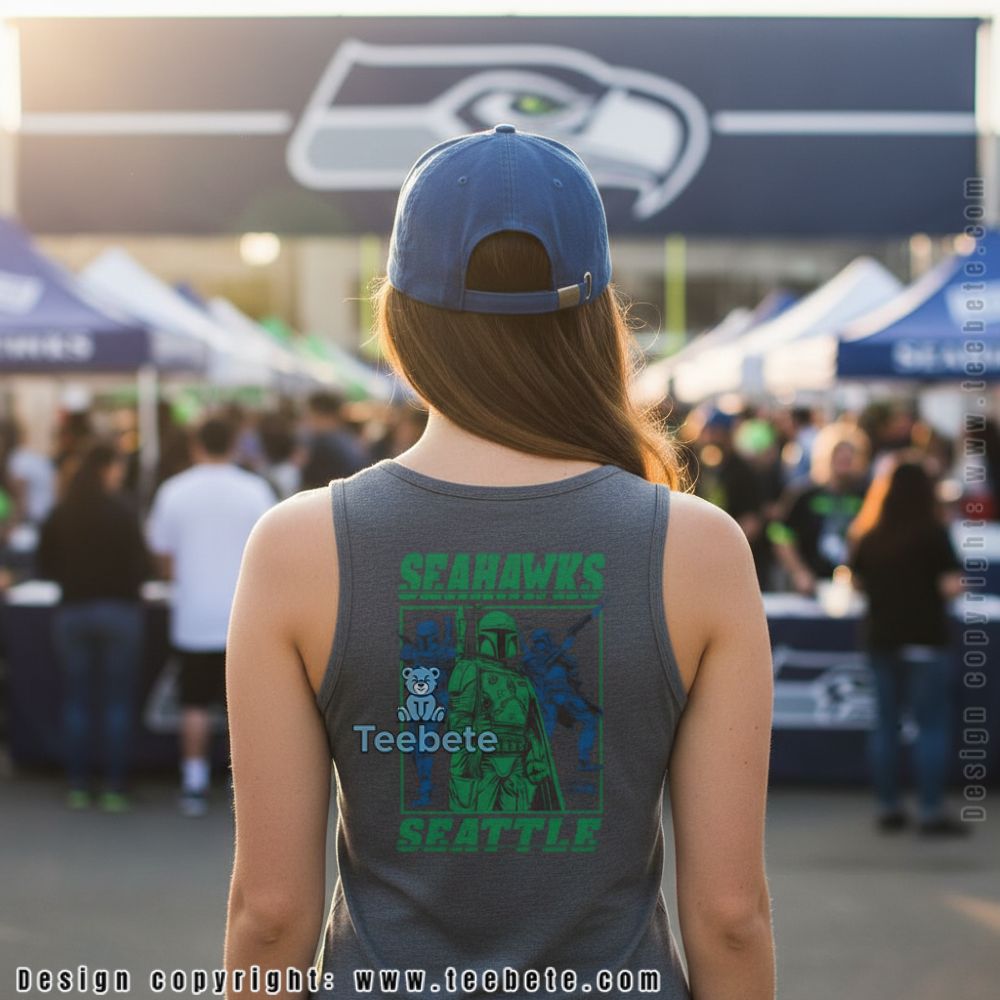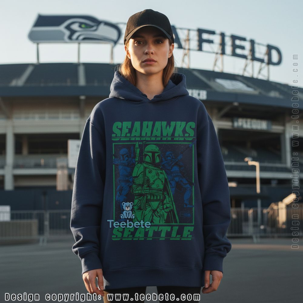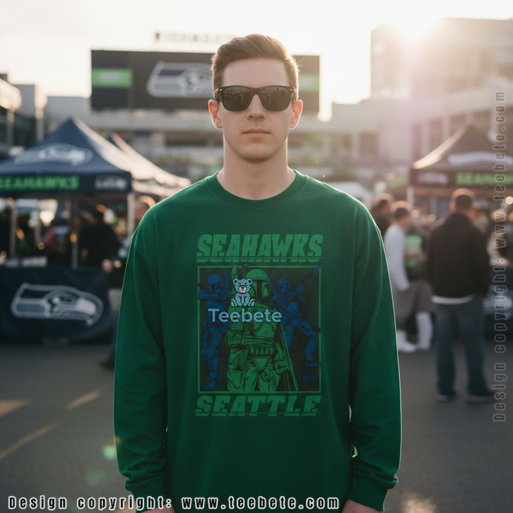 Bounty hunters don’t ask for permission, and neither do real fans. This Seattle Seahawks Boba Fett Bounty Hunter Shirt puts one of Star Wars’ most iconic characters in Seahawks colors, creating a design that resonates with fans who never outgrew either franchise. Boba Fett flanked by troopers in team green isn’t pandering to casual audiences, it’s targeted at people who know exactly why this combination works.