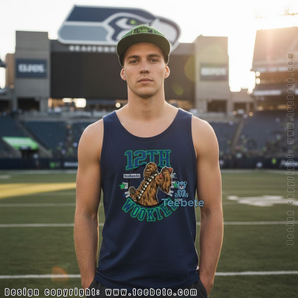 A fan-made design for Seattle supporters, this Seattle Seahawks Chewbacca 12Th Wookiee shirt combines pop culture and football fandom with a creative twist on the famous “12th Man” concept. The design features Chewbacca in team colors with “12TH” displayed prominently above and “WOOKIEE” curved below in green varsity-style lettering, flanked by stars. Shown in dark heather grey, this independently designed cotton tee is also available in multiple colors including black, navy, and sport grey.