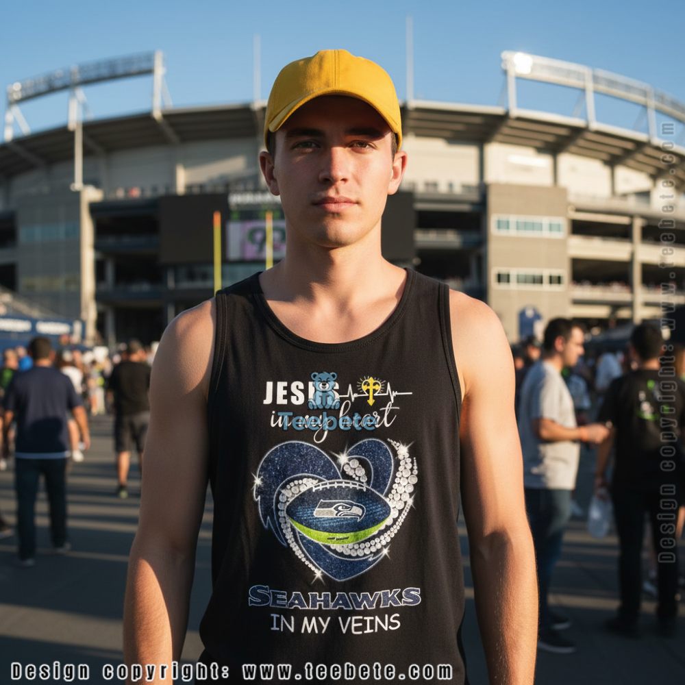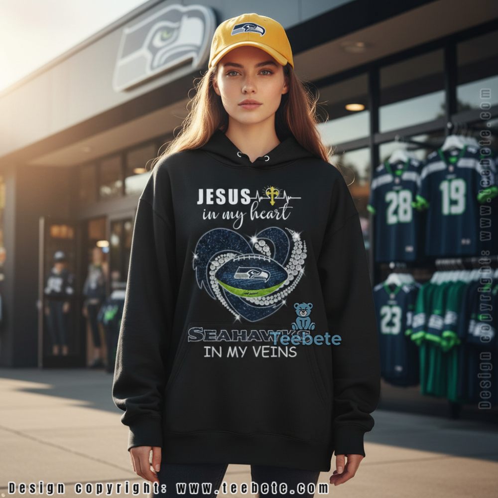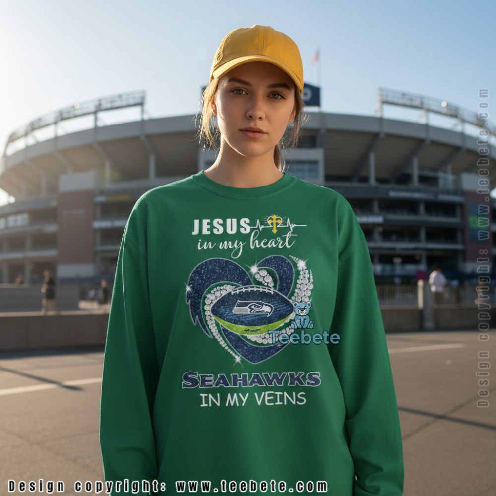 A faith-inspired design created for Seattle Seahawks fans who value their spiritual beliefs alongside team loyalty, this tee combines religious devotion with football passion. The design features “JESUS” in bold white lettering at the top with a heartbeat line and cross symbol, “in my heart” in elegant script below, a decorative heart shape filled with the Seahawks logo and team colors, “SEAHAWKS” text, and “IN MY VEINS” at the bottom. Shown in navy, this shirt is also available in multiple colors including black, gray, and team green.