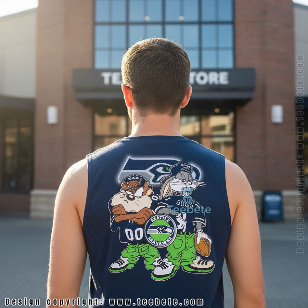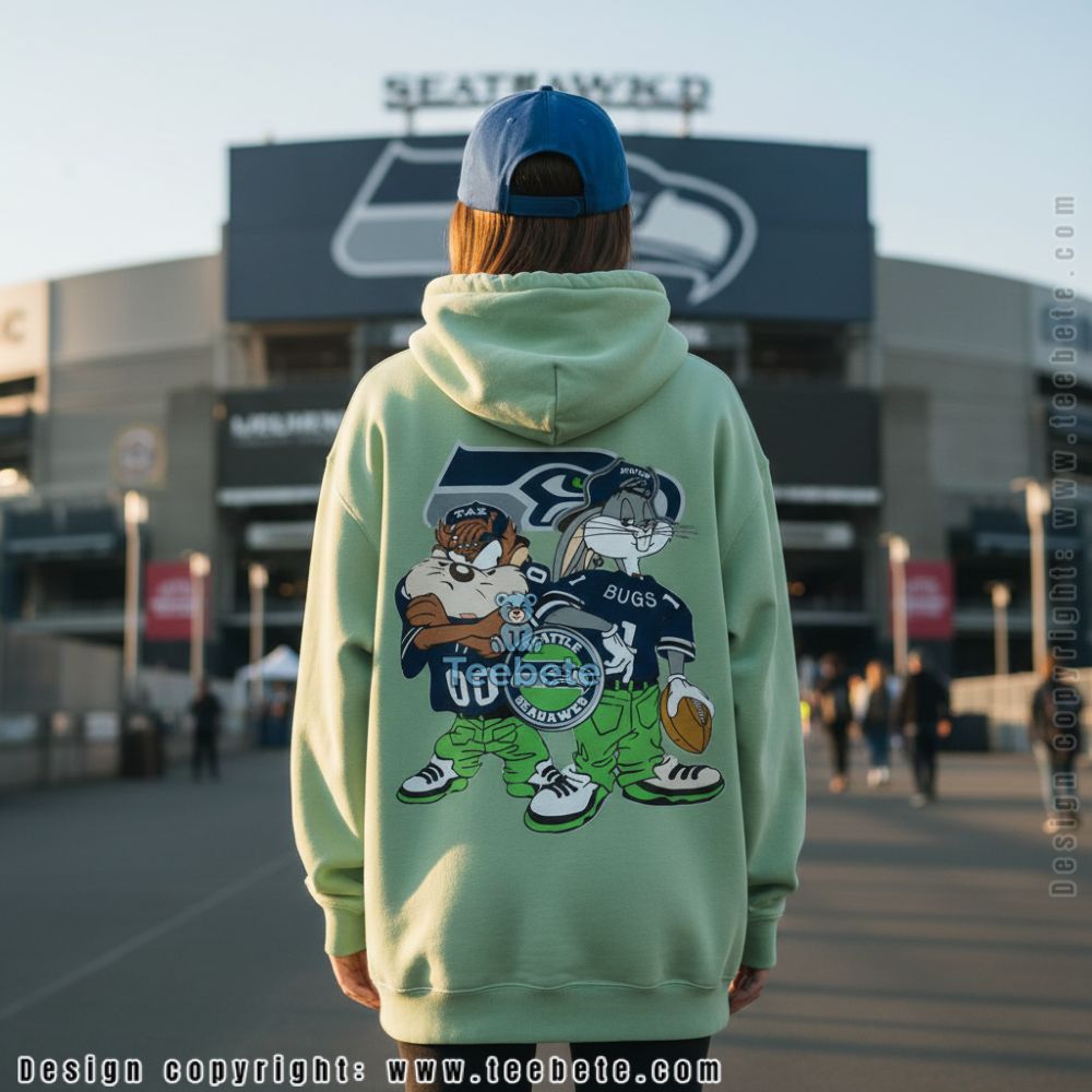 Taz wears number 00 while Bugs holds a football, both positioned above the team logo in a composition that balances cartoon energy with clear Seattle identity. The character styling captures classic animation aesthetics while the team colors ensure there’s no confusion about allegiances. Great for fans introducing younger generations to both Looney Tunes heritage and Seattle football culture through wearable art that bridges generational entertainment.