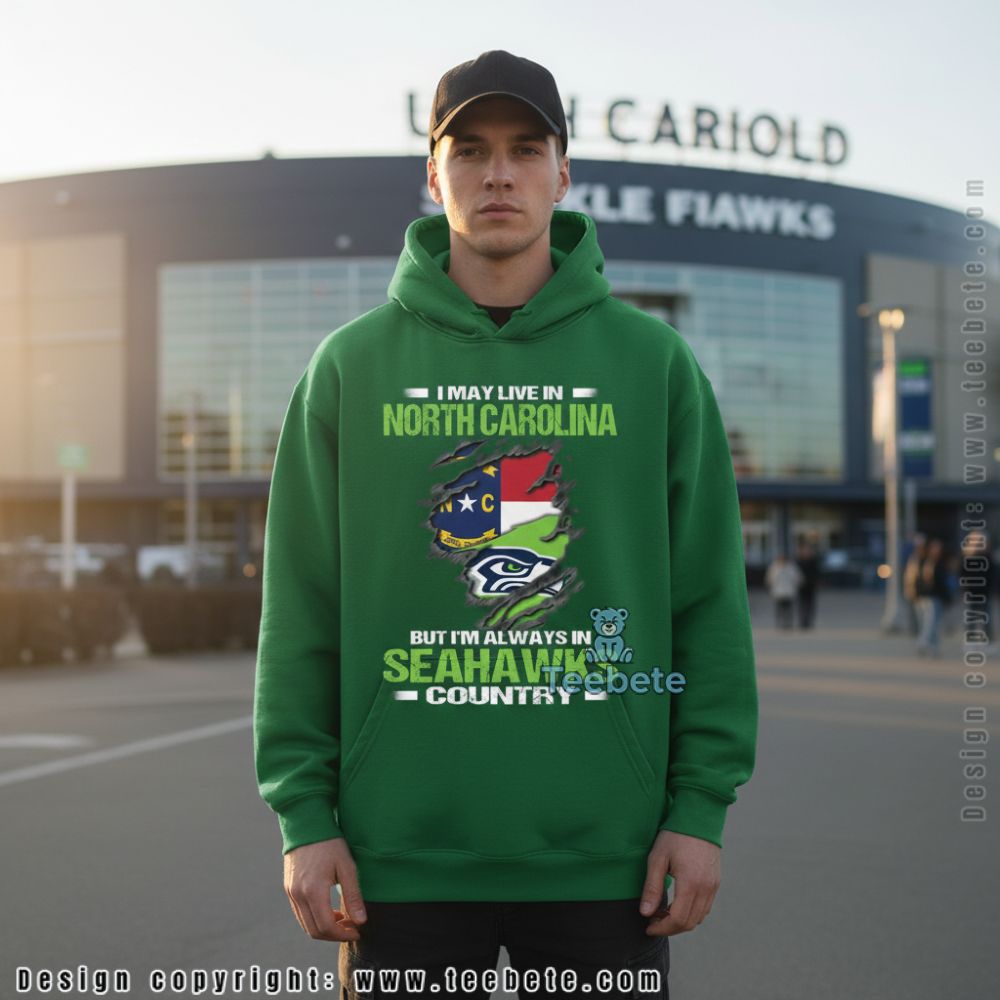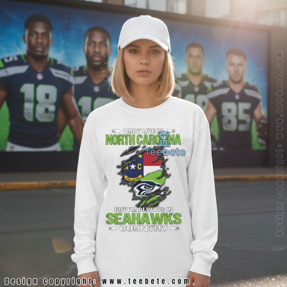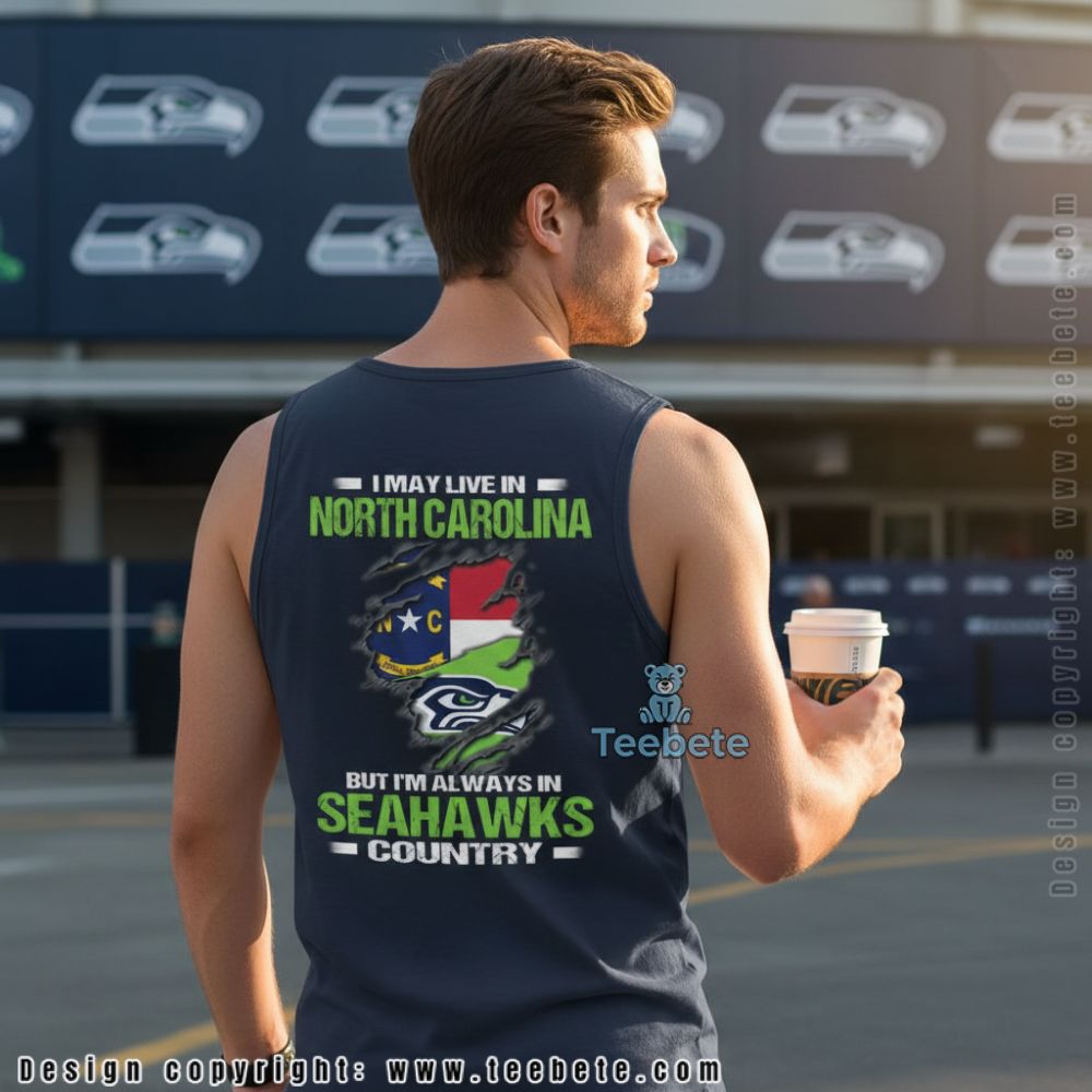 Transplanted fans will connect with this Seattle Seahawks North Carolina State tee declaring “I MAY LIVE IN NORTH CAROLINA” above and “BUT I’M ALWAYS IN SEAHAWKS COUNTRY” below. The ripped fabric graphic reveals the North Carolina state flag alongside team colors, creating a visual statement about divided geography but unified loyalty. This design speaks directly to supporters who’ve relocated but refuse to abandon their Pacific Northwest football roots.