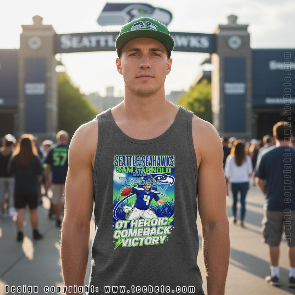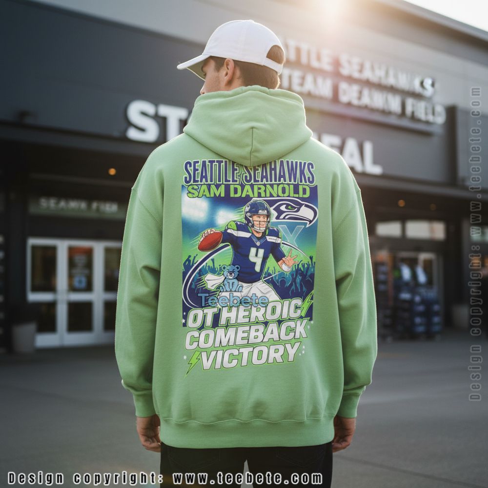 Fans celebrating unforgettable overtime drama will connect with this Seattle Seahawks Sam Darnold Ot Heroic Comeback Victory tee commemorating a thrilling finish. The design features dynamic player illustration in action pose with “OT HEROIC COMEBACK VICTORY” text emphasizing the moment’s significance. Bold comic-style graphics capture the energy and emotion of a game that came down to the final moments, making this more than standard player apparel.