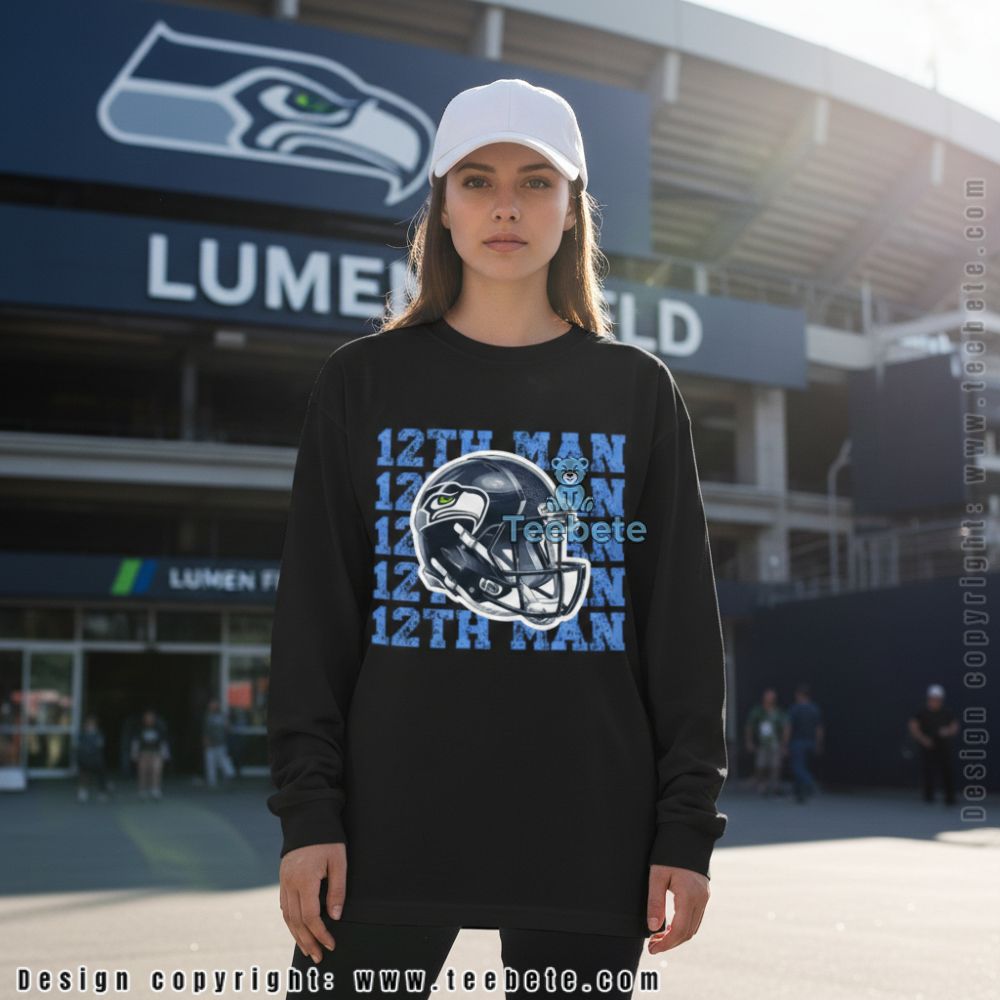 This Seattle Skyline 12Th Man tee combines community pride with bold helmet imagery, featuring repeated “12TH MAN” text that emphasizes the fanbase’s legendary reputation. A detailed helmet graphic anchors the center of the design, surrounded by faded blue lettering that creates depth and visual interest. Shown in light green, this shirt is also available in multiple colors for supporters who want variety in their game day wardrobe.