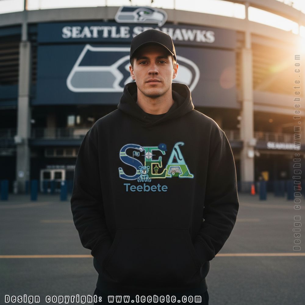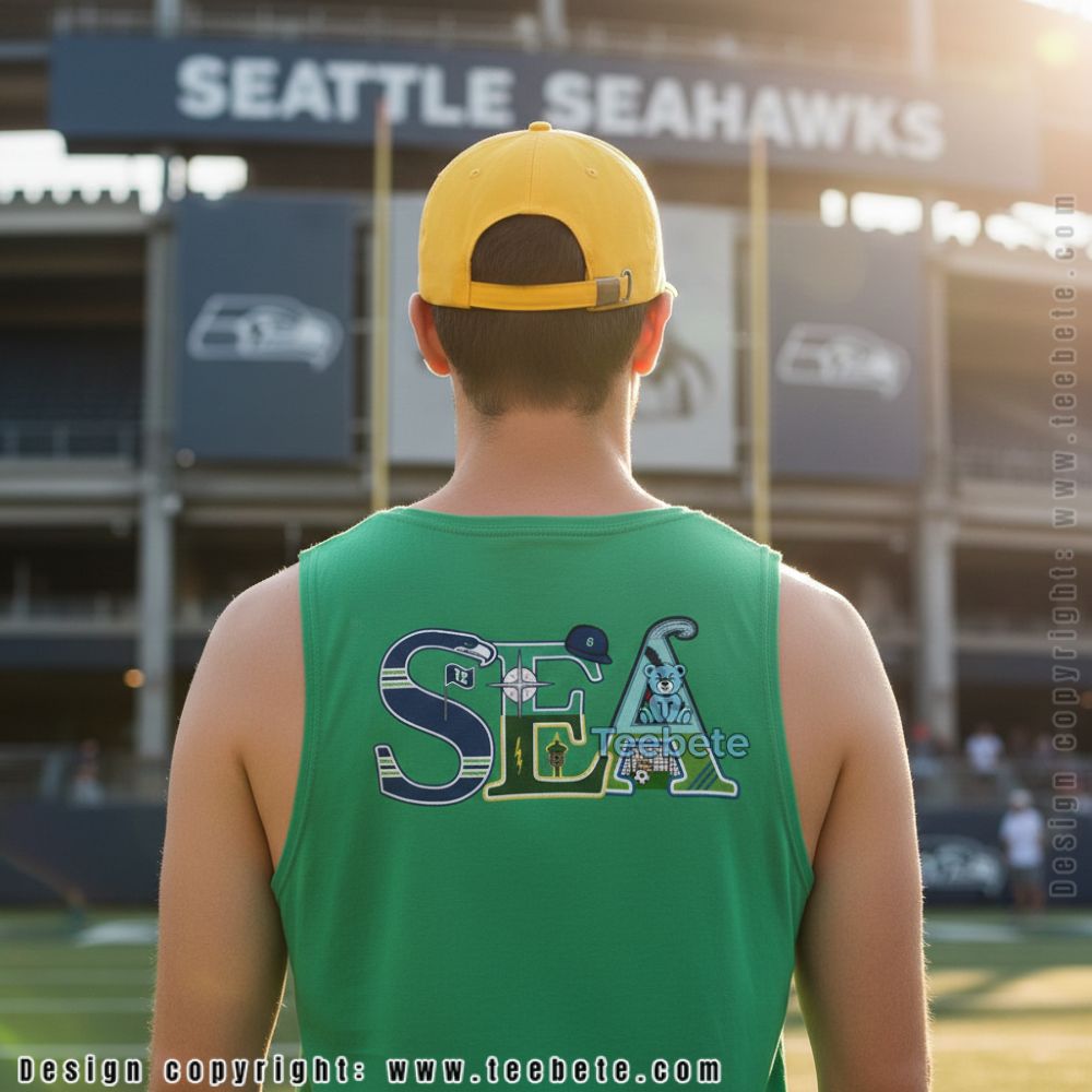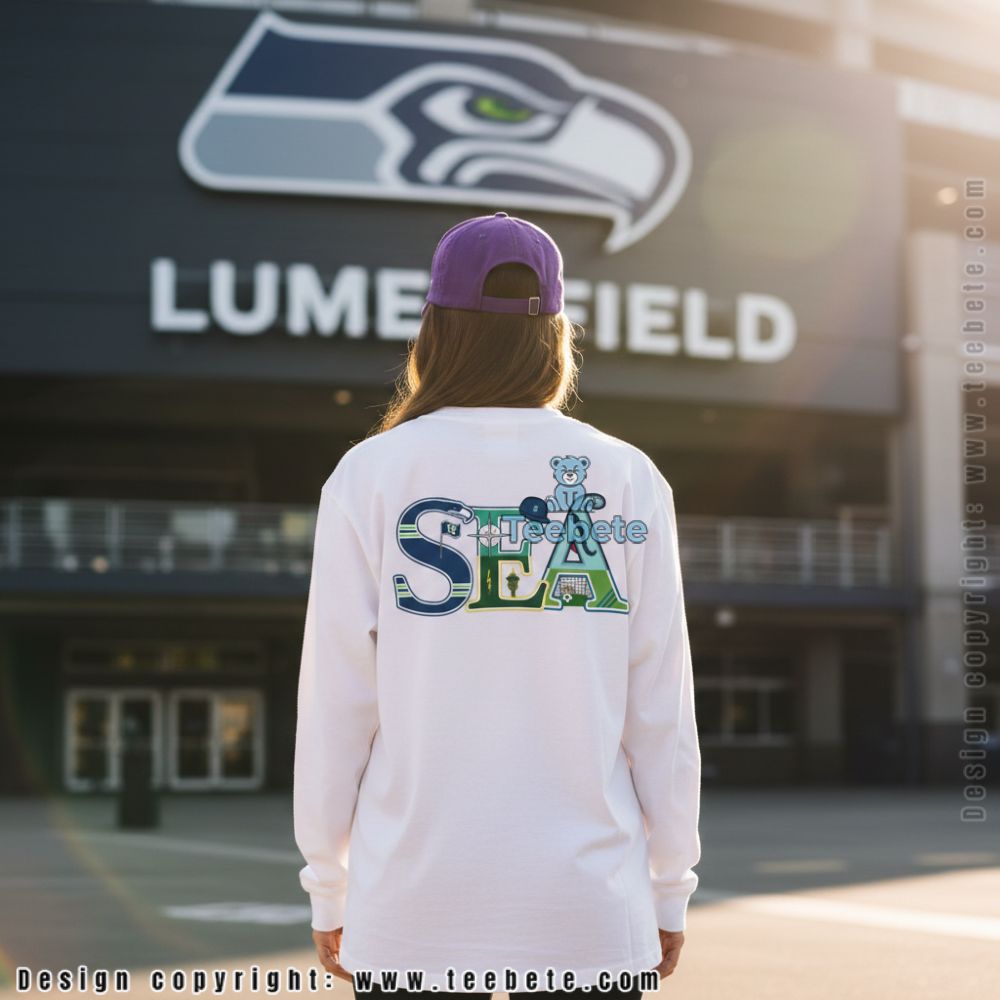 Fans celebrating Seattle’s complete sports identity will appreciate this Seattle Sports City Sea tee where each letter contains imagery from different local teams and city landmarks. The “SEA” typography incorporates football helmets, the Space Needle, and other Pacific Northwest icons in a collage style that honors the city’s full athletic culture. This design speaks to supporters who follow multiple Seattle teams and want apparel that reflects their broader sports fandom.