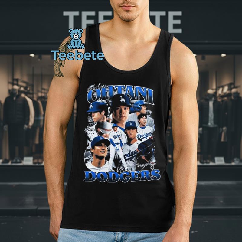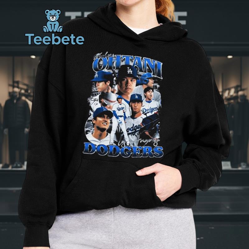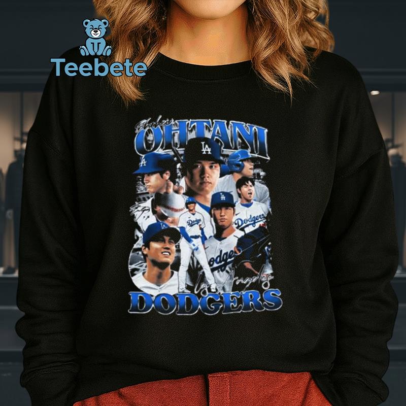 Drawing inspiration from the iconic visuals of the 90s, the Shohei Ohtani Los Angeles Dodgers T-Shirt presents a captivating blend of retro appeal and team spirit. A layered collage layout brings together vivid graphics and bold typography, prominently showcasing Ohtani’s number and name against a backdrop of the classic Dodgers logo. The color palette features deep blue and white contrasts, reminiscent of vintage sportswear, creating an impactful visual experience that resonates with fans of all ages.