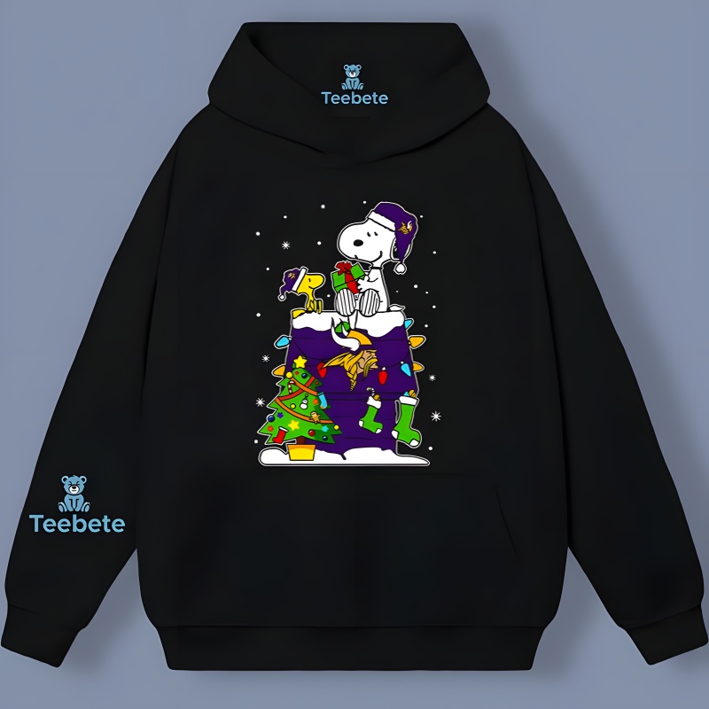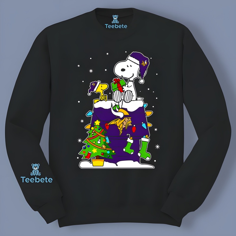 Imagine this: the snow softly falls on a Christmas Eve game at the Metrodome, the crowd roars with anticipation, and even Snoopy and Woodstock are bundled up in Vikings purple, watching from a miniature Christmas tree under the stands. This shirt captures that spirit of festive football fandom.