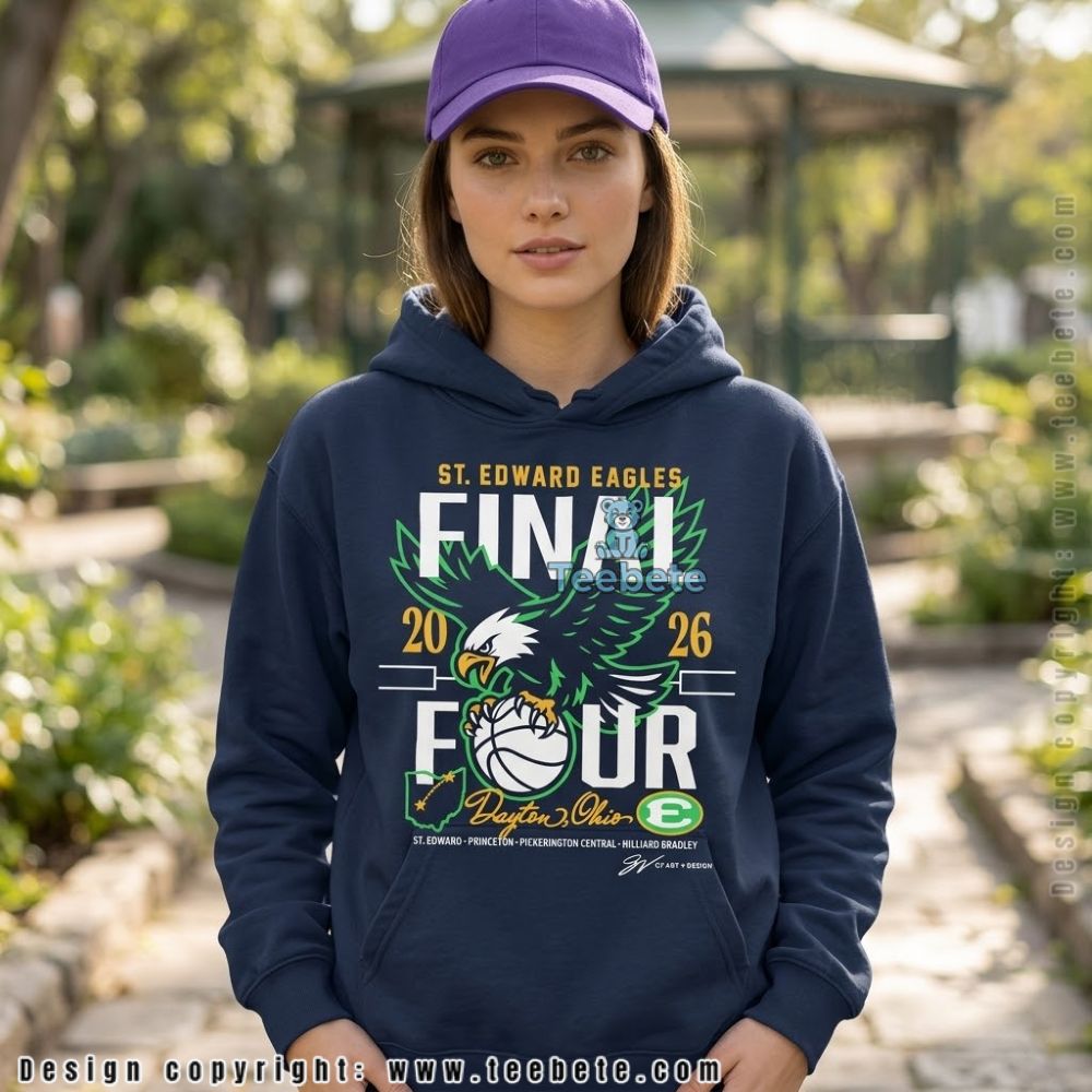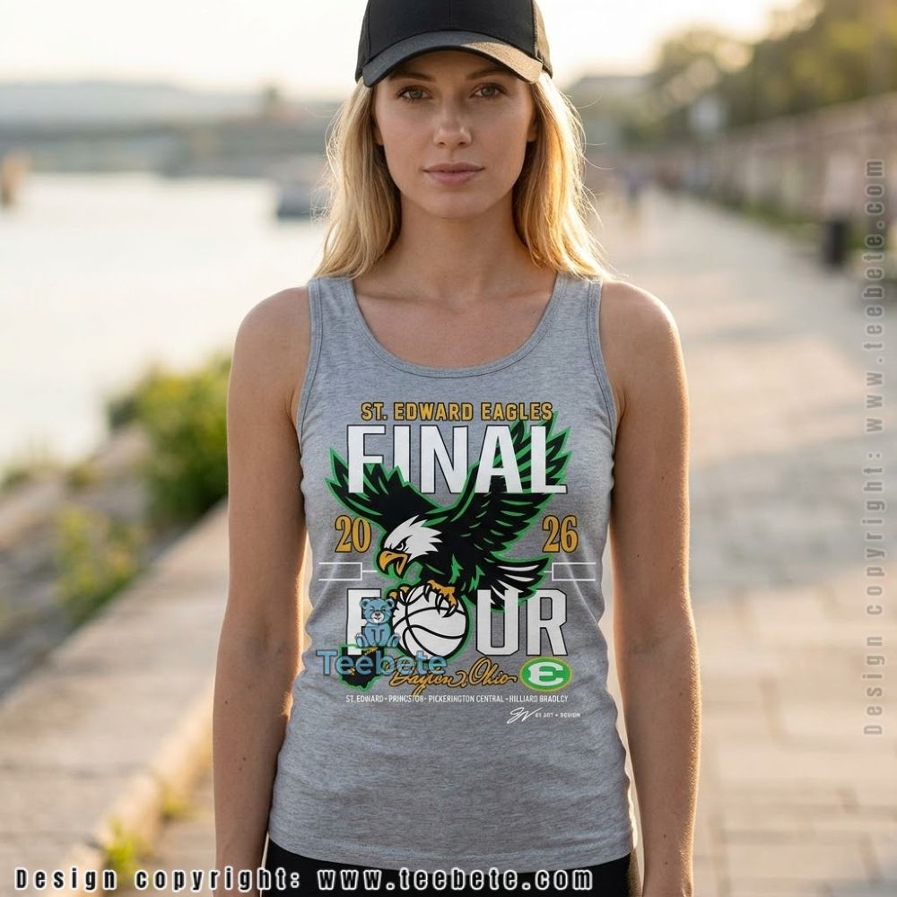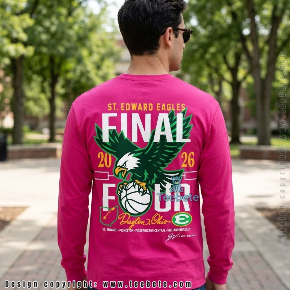 Vivid illustrations of the championship spirit take center stage on the St Edward Eagles Final Four Fan Support Shirt. This T-Shirt boasts a dynamic layout, with striking graphics that prominently display the St Edward Eagles logo, expertly arranged against a backdrop of eye-catching colors. The color palette harmonizes vibrant greens and deep blues, creating a strong contrast that draws attention, while the full-coverage print method ensures that the design makes a significant impact from every angle.