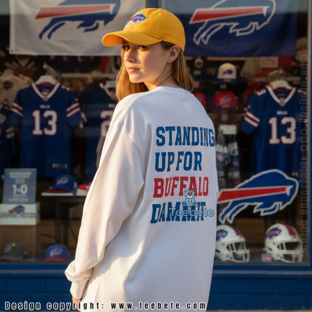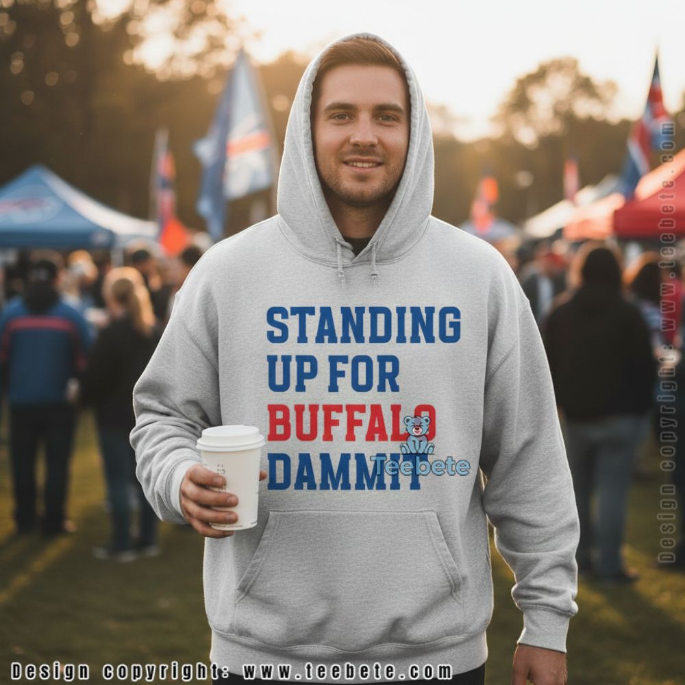 For fans looking to express their passion, the Standing Up For Buffalo Dammit Funny Shirt presents an engaging visual appeal. Crafted as a classic T-shirt, it features a dynamic arrangement of text that pops against a carefully chosen backdrop. Bold, playful typography takes center stage, complemented by whimsical graphics that resonate with the Buffalo spirit. A harmonious color palette unites shades of blue and gold, creating eye-catching contrast that accentuates the design. The use of full-coverage printing ensures that every inch of the shirt is alive with personality and charm.