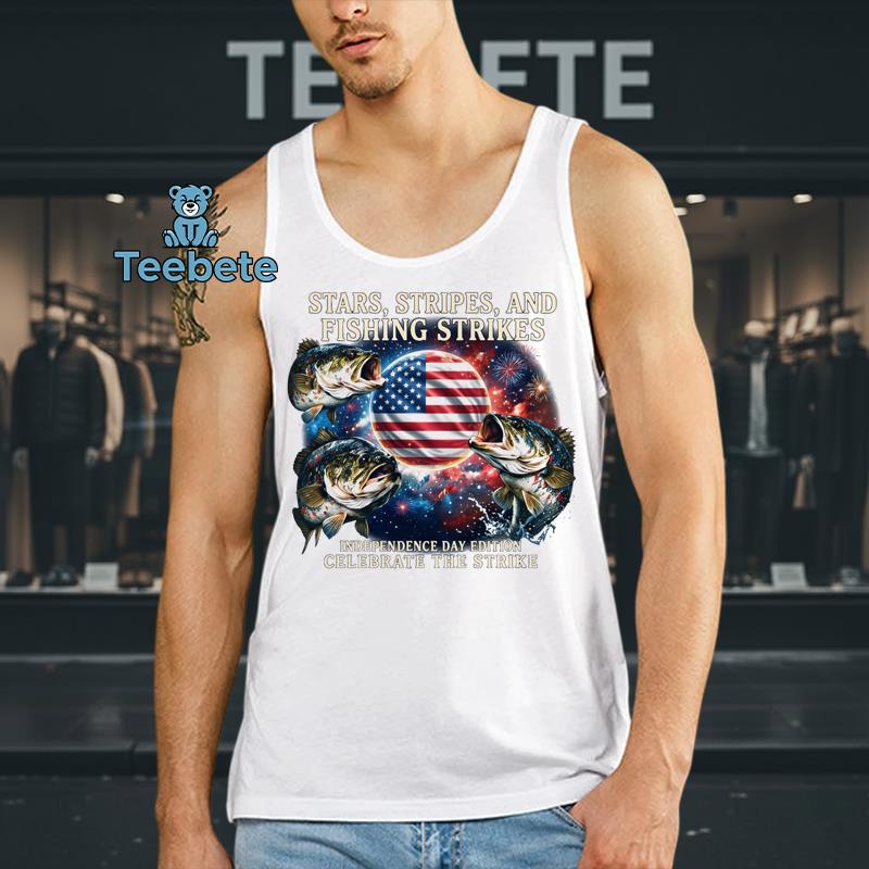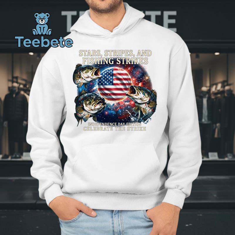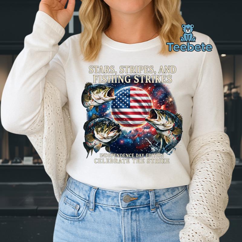 Set against a classic white backdrop, the overall aesthetic of this shirt harmoniously blends casual style with festive flair. The motifs evoke both the thrill of fishing and the spirited atmosphere of the 4th of July, making it an ideal choice for those heading to lakeside festivities or family barbecues. Whether worn for a day on the water or a backyard gathering, this T-Shirt uniquely balances patriotic themes with a lighter touch, appealing specifically to fishing enthusiasts ready to celebrate their independence in style.