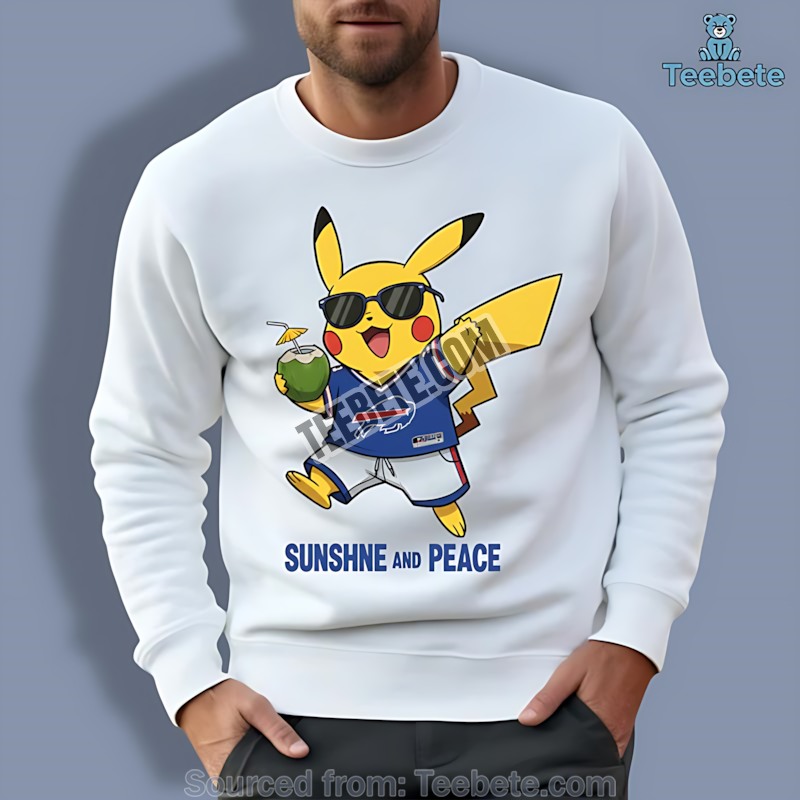 Embrace the ultimate fusion of fandom and tropical vibes with the Sunshine And Peace Buffalo Bills Pikachu Coconut Water Shirt from Teebete. This isn’t just a shirt; it’s a statement piece, a wearable embodiment of chill energy and unwavering team spirit.